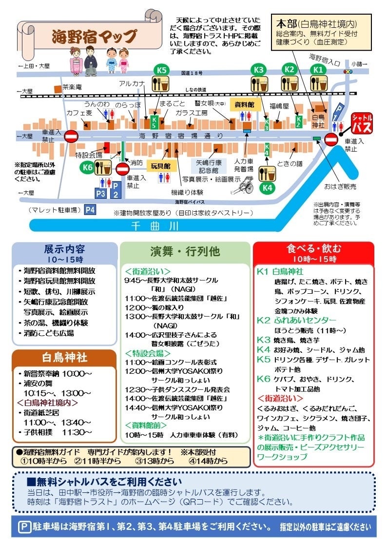 https://prcdn.freetls.fastly.net/release_image/138832/66/138832-66-2102ddbe12f3b79d5bc85a710c44e570-794×1123.jpg What is Unnojuku? Unnojuku was the name of a post town on the Hokkoku Kaido road during the Edo period. Because the historic townscape from the Edo to Meiji periods still remains, it has been designated as an Important Preservation District for Groups of Traditional Buildings and one of Japan’s Top 100 Roads. In addition, Unnojuku has been holding various special events and projects to commemorate the 400th anniversary of its founding in 2025. 400th anniversary commemorative project: https://tomikan.jp/news/unnojukukaisyuku400nen/ The Unnojuku Fureai Festival traces its origins back to the Unnojuku Hoto Festival, which began in 1990 as a tribute to the Niiname-sai festival held at Shiratori Shrine every November. It has gradually expanded in scale and has now become a major event attracting large numbers of visitors from both within and outside the prefecture, with approximately 4,600 people attending last year. Highlights of this year In addition to the usual events, such as the annual “Urayasu Dance” performed by local elementary school dancers (shrine maidens) at Shiratori Shrine, a public tour of the interior of a building designated as an Important Traditional Building, and a rickshaw ride experience, this year’s festival will also feature a special stage. The festival will be expanded from previous years, with a plethora of special performances and events along the route. Limited-edition merchandise commemorating the 400th anniversary of the founding of the shrine will also be on sale. ★Special performance★ • Shinshu University Yosakoi Festival Club Performance • Nagano University Japanese drum circle performance • Dance Studio Performance (Sany TOMI, SONA DanceStudio, STUDIO EAST) • Ondeko performance by a Sado traditional performing arts group • Uminojuku Art Competition Award Ceremony, etc. In addition, this year we will be holding a pre-event party for the first time! At Shiratori Shrine, you can enjoy a jazz concert, Japanese drumming performances, and wines from Tomi City at the wine bar. Eve festival Date and time: Saturday, November 1, 2020 5:00 PM – 7:00 PM Location: Shiratori Shrine grounds (1204-1 Honunno, Tomi City) Contents: Jazz concert, Japanese drum performance, wine bar (serving wine from Tomi City) Price: Free admission Parking: Unnojuku Parking Lots 1 and 2 The 31st Unnojuku Friendship Festival 400th Anniversary Edition Date and Time: Sunday, November 2, 2025, 10:00 AM – 3:00 PM (Opening Ceremony from 9:30 AM) Location: Unnojuku (around the highway) Fee: Free admission Parking: Unnojuku Parking Lots 1, 2, and 3, Unno Mallet Golf Course Parking Lot (riverbed), and Tomi City Hall Parking Lot (shuttle bus available from City Hall) *Free parking at all *The area will be pedestrianized during the festival. Special shuttle bus: Departing from Tanaka Station → via City Hall → to Unnojuku (Parking Lot 1) *Operating times can be found on the website below.
