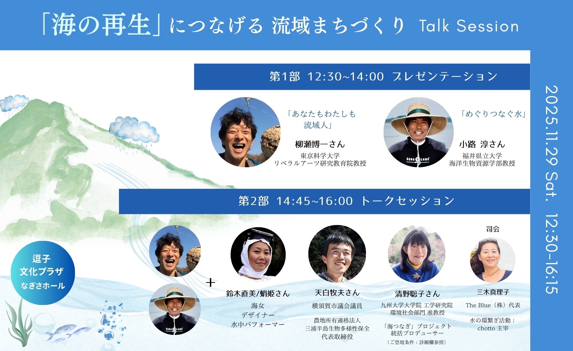 Infrastructure, Transport and Tourism (MLIT) has been promoting “watershed flood control” since 2000. In recent years, “rain gardens” and other “green infrastructure” (the concept of utilizing the functions of the natural environment to solve various social issues) have become a hot topic at both the public and private levels. However, concerns have been raised about subsidy-seeking activities and greenwashing (when companies suggest that their business models, activities, or products have a net positive or net neutral impact on the environment, despite the possibility that they may actually harm the environment), further increasing the need for an “understanding of the unique topography and natural environment of each region.” [Purpose] Based on this background, this talk event will: – An introduction to “watershed thinking” by researchers and practitioners on “water” – Learn about the “water cycle from land to the ocean,” including research on the new field of “submarine springs” and an academic explanation of the concepts of “forest, river, and sea connections” and “satoumi.” Through these efforts, we aim to promote the practice and implementation of ideas that can be applied to daily life and urban development, such as “regenerating the marine environment from the entire watershed,” “disaster mitigation,” and “restoring primary industries.” Event Overview ・Event Name: “Talk Session on Watershed Urban Development Linked to ‘Ocean Regeneration'” ・Date and Time: Saturday, November 29, 2025, 12:30-16:15 ・Venue: Zushi Culture Plaza Nagisa Hall (2F, 4-2-10 Zushi, Zushi City, Kanagawa Prefecture) (An archived version will be available at a later date) ・Participation Fee [In-person Participation] Adults: ¥5,000 Students (high school students, university and graduate students under 24): ¥2,000 Persons with a disability certificate (one accompanying person free): ¥2,000 Middle school students and younger: Free (Archived video available for viewing at a later date) [Online distribution at a later date] Adult: ¥4,000 Students (high school students, university and graduate students under 24): ¥1,500 Persons with a disability certificate: ¥1,500 *For both in-person and online participation, please watch the video “Ask a Female Researcher about the Oceans of the Miura Peninsula (featuring Satoko Kiyono, who will be speaking in Part 2)” (approx. 55 minutes) produced by The Blue Co., Ltd. (with a link to watch) ・Capacity: [In-person participation] 500 people [Online distribution at a later date] No limit on participation ・Target audience: The general public, business people, government officials, etc. with a strong interest in ocean and environmental issues [Program] 11:45 Doors open 12:30 Part 1: Presentation “You and I are River Basin People” by Hirokazu Yanase (Professor, Tokyo University of Science) “Circulating Water” by Jun Koji (Professor, Fukui Prefectural University) (Break: 14:00-14:15) 14:15 Part 2: Discussion: “River Basin Urban Development Linked to Ocean Regeneration” Speakers: The following five people 15:45 Q & A 16:00 Raffle (signed books by speakers, merchandise from popular local shops) 16:15 Closing [Speakers] ■Part 1: Presentation