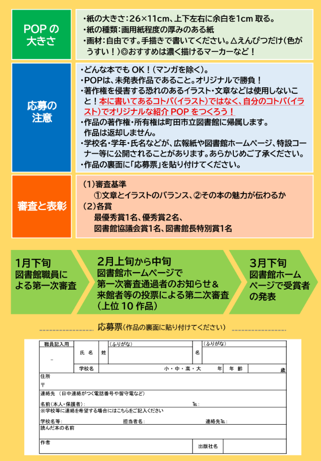 https://prcdn.freetls.fastly.net/release_image/52170/751/52170-751-e1dc4a511b7fb326798f21133507b7ec-637×915.png Contest flyer (back) Submit your application in person to any city library or the Civic Literature Museum, or by mail (must arrive by this date) to the Central Library Planning and Community Support Section (3-2-9 Haramachida, 194-0013) by Sunday, January 18, 2026. *For details, please refer to the Machida City Central Library website. https://www.library-machida.tokyo.jp/report/ ■ Contest Flow (1) Select recommended books, create a POP, and submit it to your local city library or municipal literature museum. (2) First round of judging (judging by library staff) (3) Second round of judging (voting by library visitors, booksellers, people who are active in reading, etc.) (4) One Grand Prize winner, two Excellence Prize winners, one Library Council Award winner, and one Library Director’s Special Award winner will be selected and awarded. The winning works will also be made into bookmarks and distributed at libraries and bookstores in the city. ■ Cooperation Kinokuniya Bookstore Odakyu Machida Store, TSUTAYA Machida Kiso Store, Kumido Main Store and Honmachida Store, Book First Lumine Machida Store For more information about this release