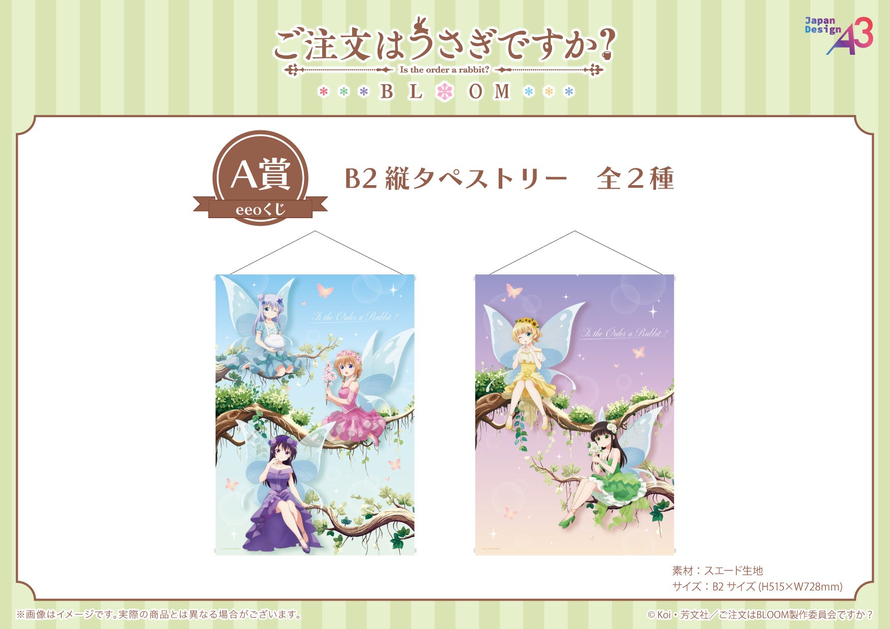 https://prcdn.freetls.fastly.net/release_image/12048/998/12048-998-557bc317ab189296ec92b257c6cfc2f8-1754×1240.jpg The rarest S prize in the “eeo Kuji” for “Is the Order a Rabbit? BLOOM” is an acrylic block measuring approximately 10cm in height and 15cm in width! It’s about 2cm thick, so it can be displayed upright. You’re guaranteed to get the S prize if you purchase the “eeo Kuji” 50 times in one transaction. Check the image for details! A prize B2 vertical tapestry (2 types in total)