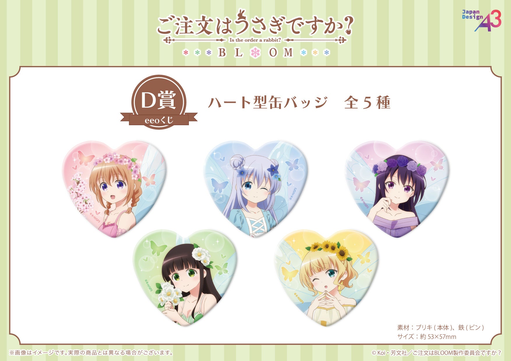https://prcdn.freetls.fastly.net/release_image/12048/998/12048-998-38a38655cbb8e1a8526fc8a2e3f86c1f-1754×1240.jpg Prize D is a heart-shaped can badge measuring approximately 5.3cm x 5.7cm. The design features a close-up of Cocoa and friends’ faces, allowing you to enjoy their expressions up close! ▼Visit the eeo Store online▼ Order here! (C) Koi・Houbunsha/Is the Order a BLOOM Production Committee?