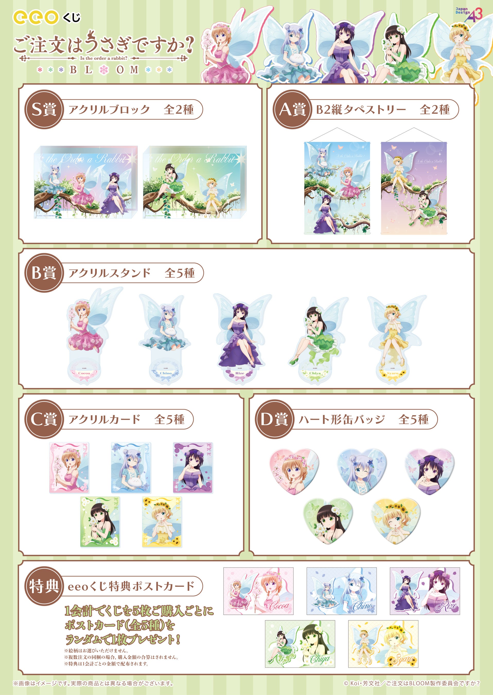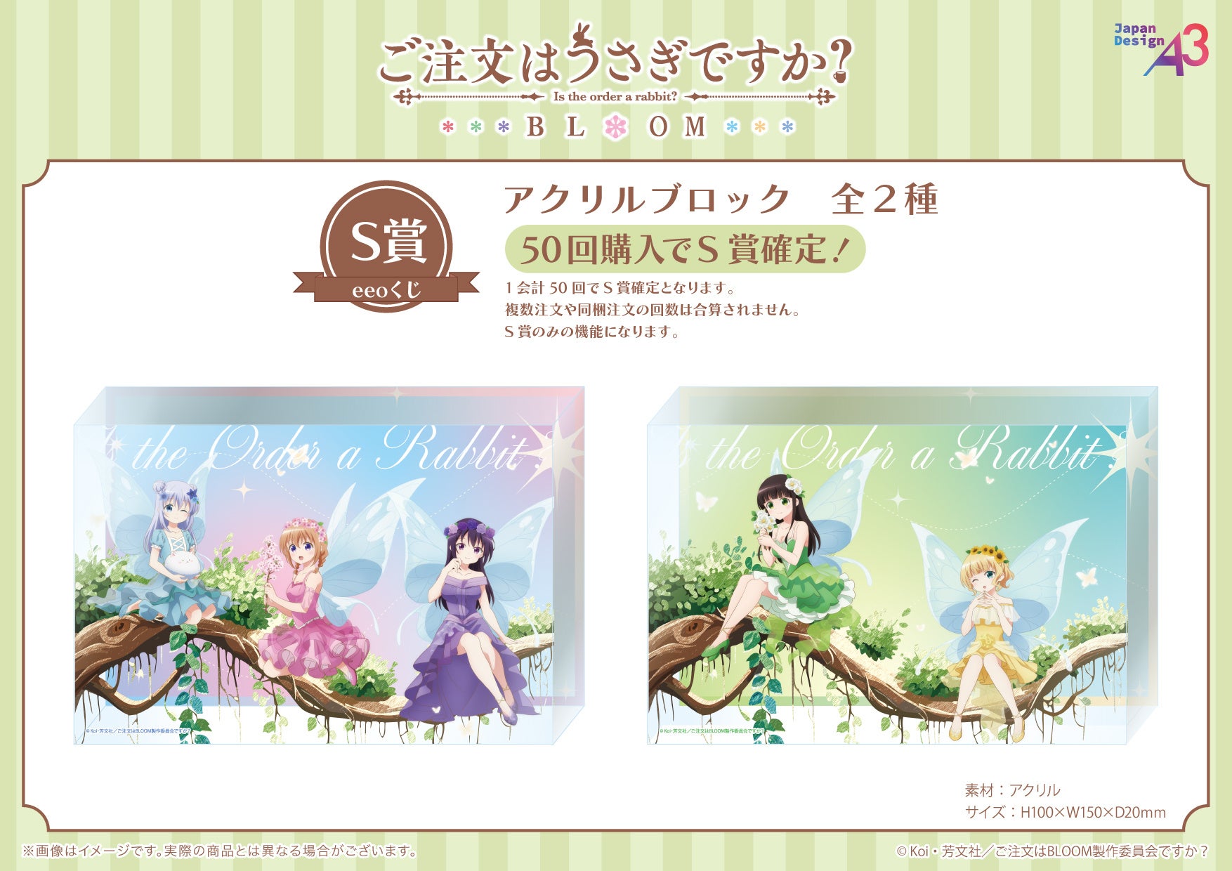 https://prcdn.freetls.fastly.net/release_image/12048/998/12048-998-9ee1b10547f9b27c7de5b5b171d9063d-1754×1240.jpg For every five “Is the Order a Rabbit? BLOOM” “eeo Lottery” tickets purchased in one transaction, you will receive one random postcard (out of five types). The postcards feature original illustrations, so be sure to get one along with your prize♪ S Prize Acrylic Block (2 types)