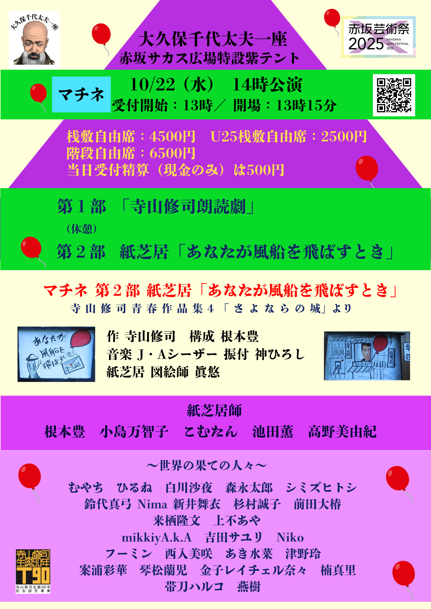 https://prcdn.freetls.fastly.net/release_image/13972/3348/13972-3348-96931e5bdead97418d130987ae00bebb-1414×2000.png Okubo Chiyotayu Troupe “Terayama Shuji 90th Birthday & Kara Juro 85th Birthday Grand Commemoration Festival” to be held at Akasaka Arts Festival 2025! The Okubo Chiyotayu Troupe launched in 2020 with the Shuji Terayama Reading Play & Live “Pull the Trigger! Words are Weapons! Let’s Go!” Since then, it has been held every year and continues to expand in scale. Although it is called a reading play, there are many performances that do not use a book, and the performers are diverse, including dancers, singers, and actors! Each performer will play the lead role in their own production. The stage art is by art artist Mantam. Choreography by Hiroshi Kami. Program introduction Show begins at 2:00 PM “Terayama Shuji Reading Drama” & “Kamishibai: When You Let the Balloon Fly”