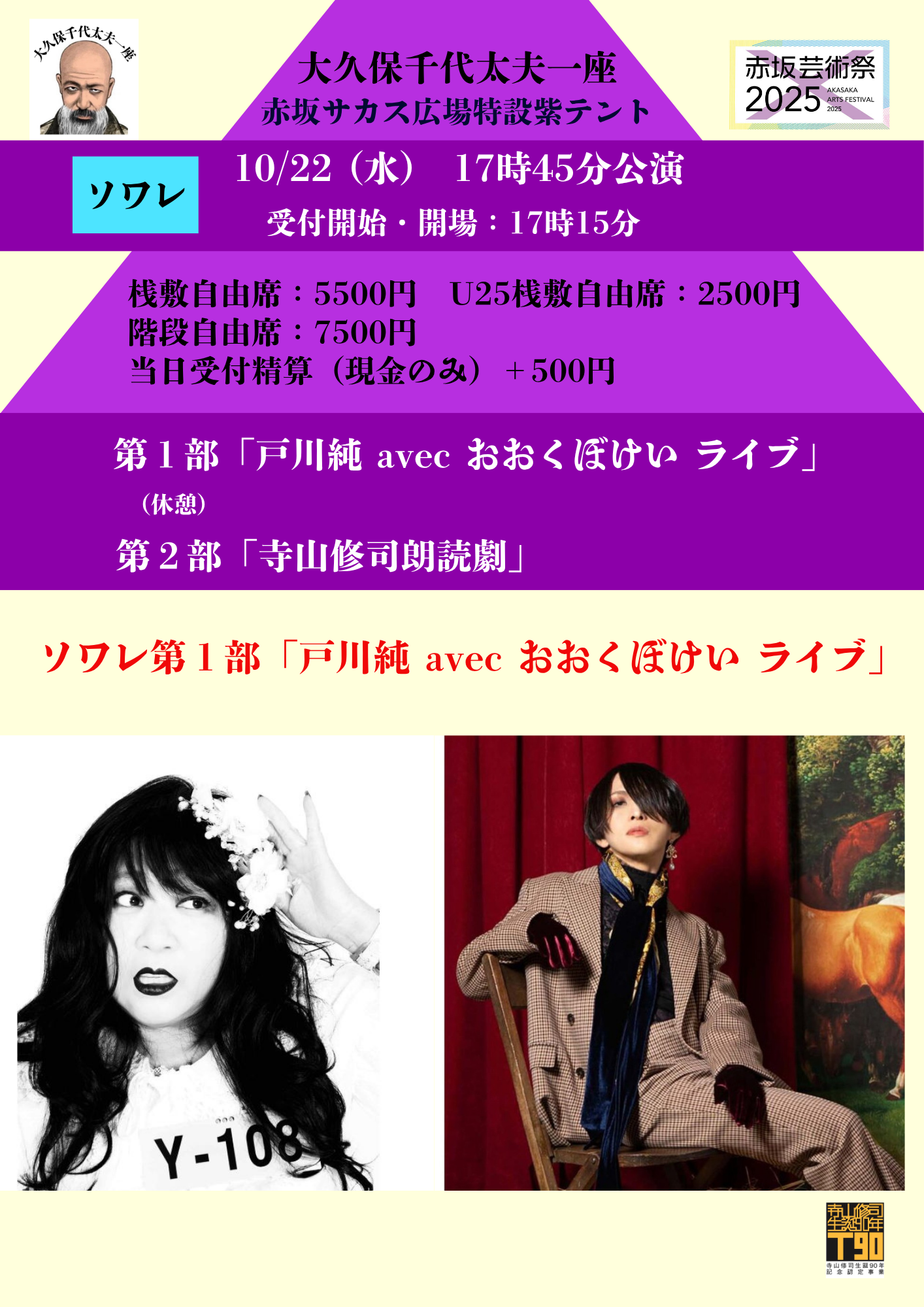 Confetti Press release: October 21, 2025 [Akasaka Arts Festival 2025] Akasaka Sacas Square Purple Tent, Wednesday, October 22nd: Okubo Chiyodayu Troupe “Terayama Shuji 90th Birthday & Kara Juro 85th Birthday Grand Commemoration Festival” Tickets on sale now at Confetti! A huge commemorative festival packed with events including “Terayama Shuji Reading Drama,” “Terayama Shuji Theater Kamishibai,” and “Togawa Jun avec Ookubo Kei Live”!