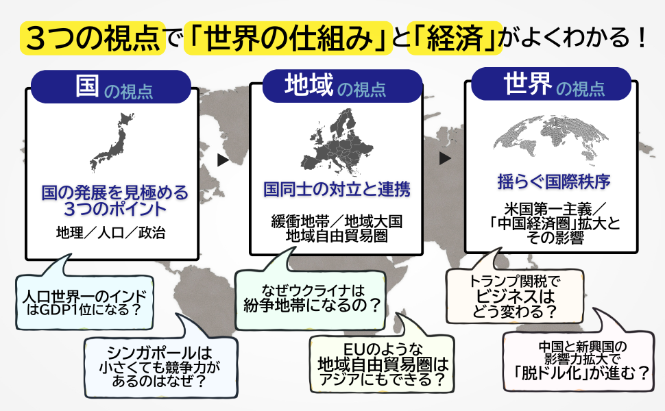 https://prcdn.freetls.fastly.net/release_image/4767/252/4767-252-6377c8195a786ecdf2c688e5313f7cdc-941×668.png This interactive book helps you understand the world’s complex systems and economic relationships step by step. Another notable feature of this book is that it gradually broadens its perspective from “nations” to “regions” and then to the “world”. You can learn about complex global situations in an orderly manner, starting with the basic information that forms the foundation.