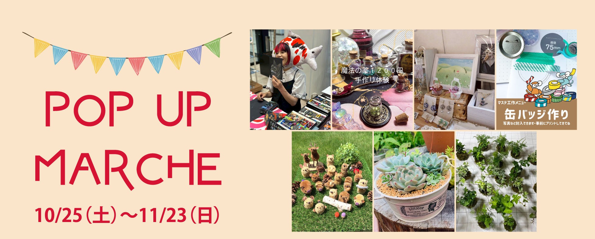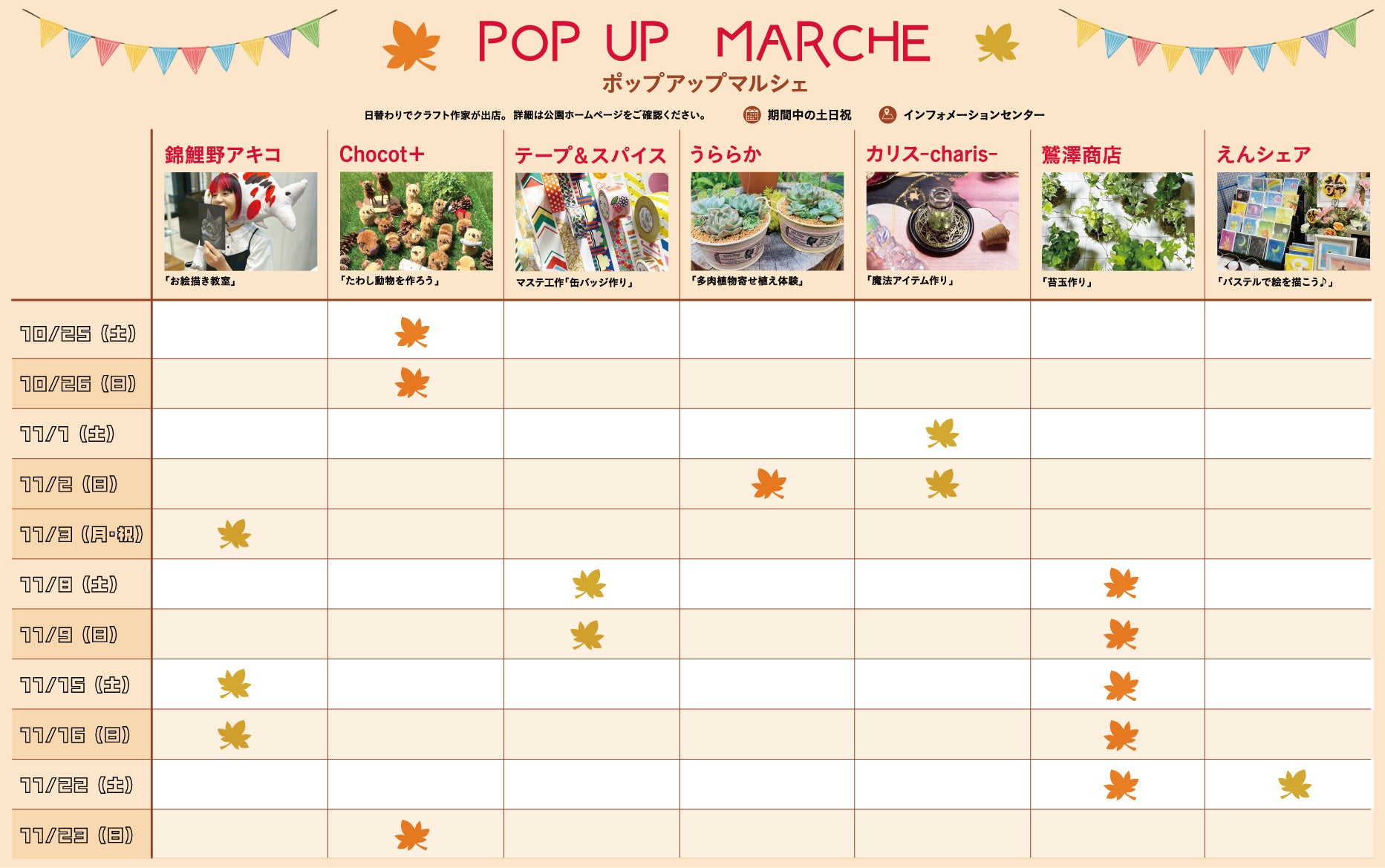 https://prcdn.freetls.fastly.net/release_image/32901/579/32901-579-703460b341531f87b4d42201066784ad-1865×1169.jpg Store opening calendar Learn more ◆Daily Workshops & Art Sales Seller name Store opening date Workshop Sale of works Akiko Nishikigoino 11/3 (Mon/Holiday), 15 (Sat), 16 (Sun) Koi-chan’s Drawing Class [Participation Fee: ¥1,000 per session] Chalkboard Drawing Supplies Chocot+ 10/25 (Sat), 26 (Sun), 11/23 (Sun) Make a scrubbing brush animal [Participation fee: 700-900 yen] Scrubbing brush animals, baby rubber clips, kids’ bracelets, key chains, etc. Tape & Spice 11/8 (Sat), 9 (Sun) Masking Tape Craft “Making Can Badges” [Participation Fee: ¥350 each] Uraraka 11/2 (Sun) Succulent plantings [Participation fee: Starting at 1,000 yen] Succulent plantings, seedlings, repurposed pots, and miscellaneous goods Charis− 11/1 (Sat), 2 (Sun) Magical Item Making [Participation Fee: