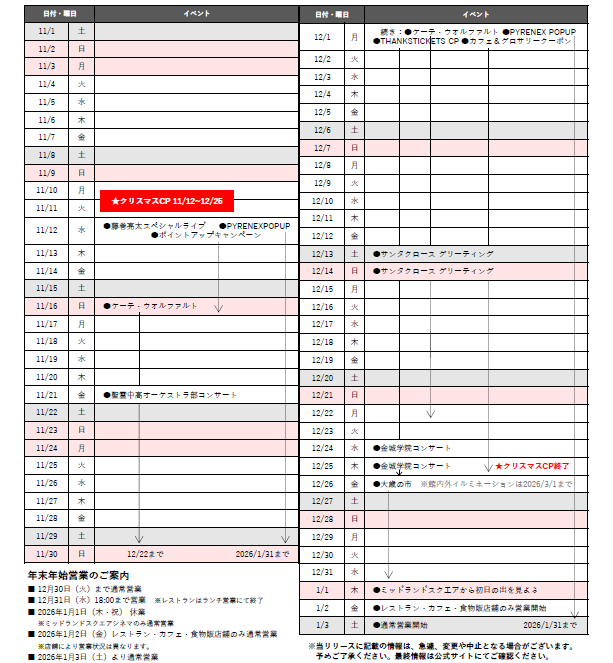 Participating stores: Pierre Marcolini, Tomizawa Shoten, Dean & Deluca, Patisserie GIN NO MORI, Ishikon, Rasul Au Bacanal, Salon de Mon Cher, Bakery & Restaurant Sawamura, Bicerin, Bistro Inacheve Midland Square Members App Members THANKS TICKETS Gift Campaign During the campaign period, members who spend 100,000 yen or more (tax included, combined purchases allowed) at participating stores will receive THANKS TICKETS via the Members App, which can be used during the campaign period. ■ Period/December 1st (Monday) to December 25th (Thursday) ■ Usage period: January 2, 2026 (Friday) to February 28, 2026 (Saturday) ■ Ticket Contents / 1. ¥1,000 OFF (2 tickets)…Can be used at participating restaurants, no terms and conditions apply 2. ¥10,000 OFF (1 ticket)…Can be used on purchases of ¥55,000 or more (tax included) at participating retail stores 3. Two ¥1,000 movie tickets… Admission to Midland Square Cinema 1 and 2 is ¥1,000. *Additional fees apply for some films and seats. Special screenings are not included. *Some stores are not eligible for this campaign. Please visit the official website for details. *The merchandise store will be closed on Friday, January 2, 2026. *The museum will be closed on Monday, February 16, 2026.