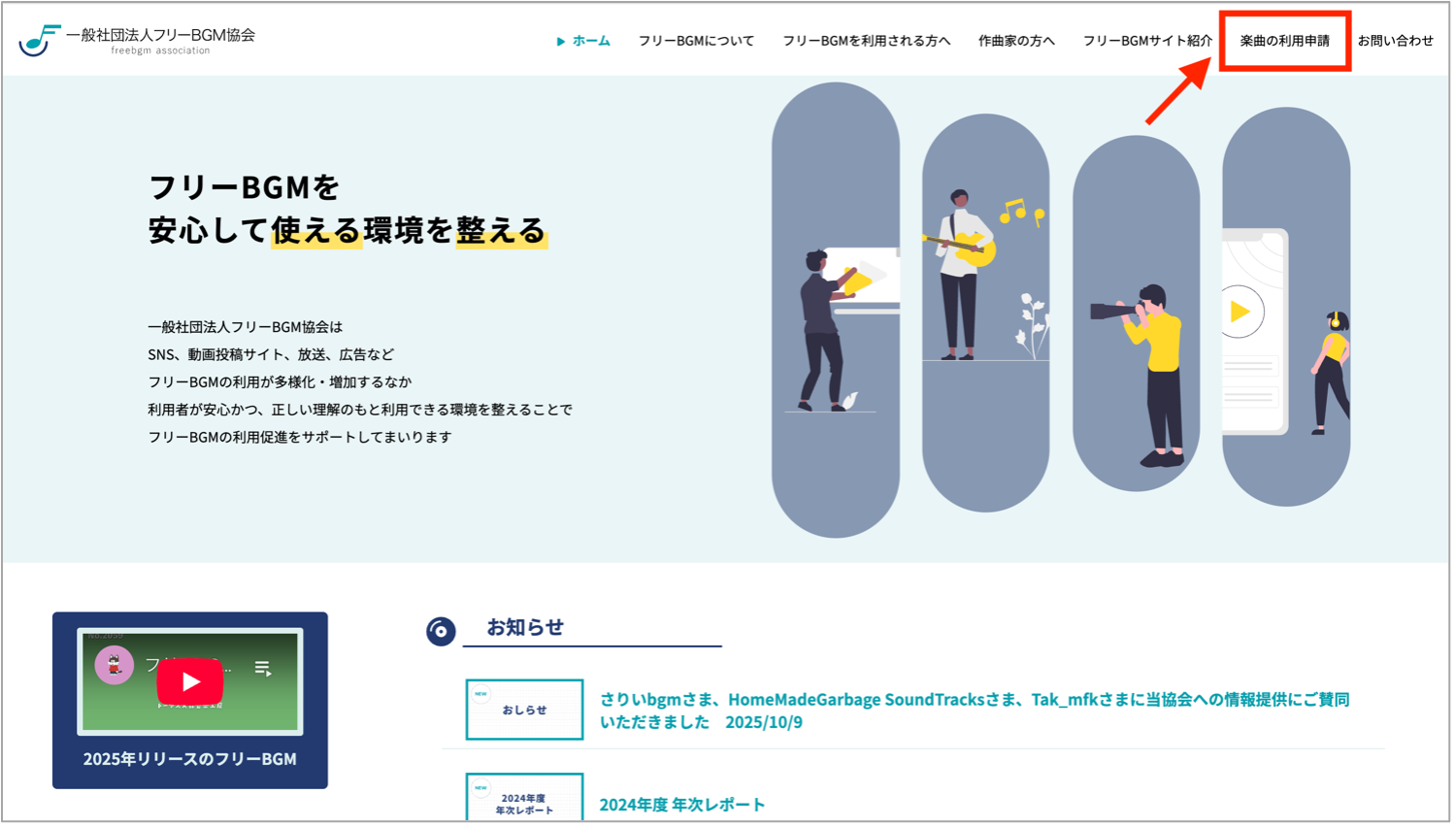 Free BGM Association (General Incorporated Association) Press Release: October 22, 2025 The Free BGM Association has set up an application window for using music from various free BGM composers and distribution sites. One-stop service to improve convenience and safety in the business use of free background music On Wednesday, October 22, 2025, the Free BGM Association (hereinafter referred to as the “Free BGM Association”), a general incorporated association, launched a music usage application window across free BGM composers and distribution sites on its official website for business users who want to use free BGM in corporate videos, games, events, commercials, and television and radio broadcasts. The window also began granting licenses on behalf of composers based on
