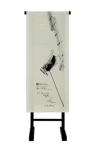 hand-painted Kyoto Yuzen technique on silk fabric. Bringing together the traditional techniques of Kyoto Yuzen, our artisans devote their skills to every step of the process, from sketching to applying glue, coloring, and gold leaf. In addition to hand-painted Kyoto Yuzen pieces, we also offer works using a variety of materials and techniques, including pieces incorporating calligraphy. Using traditional dyeing techniques, we express the beauty of masterpieces and the artistry of fabric in a modern form. 【About the Works with Kyoto Kitcho】 Based on Uemura Shōen’s Sunny Room, Yosa Buson’s The Raftmaster, Sakai Hōitsu’s Thin Chrysanthemums, and Sakai Hōitsu and other collaborative works, Fan Paintings: A Collaboration of Artists, all of which are owned by Kyoto Kitchō, these silk works have been created using Eirakuya dyeing techniques. All of these are valuable works of art in the history of Japanese art, and their beauty has been captured on fabric using dyeing techniques. 【About the work with Ikenobo Ikebana】 This silk work is based on “Standing Flowers and Sand” (Illustration 21), owned by the Ikenobo School of Ikebana. This is a standing flower arrangement by Ikenobo Senko II, who was active in the early Edo period. It features a pine tree at the center and Japanese pampas grass swaying in the wind, and is expressed using the Kyoto Yuzen dyeing technique. 【About my work with Taro Yamamoto】 Japanese artist Taro Yamamoto has created a new work based on the design “I Used to Be Called ‘Momotaro,'” originally published by Eirakuya in 1932. Eirakuya has reinterpreted the original artwork with a modern sensibility and produced a silk work based on it. 【About my work with Aki Nakata】 Calligrapher Aki Nakata used her brush directly on the silk scroll and scarf fabric to write the characters for “love,” “rain,” and “light.” Using ink for the silk scroll and dye for the scarf, the pieces combine the power and delicacy of calligraphy while taking advantage of the texture of pure silk.