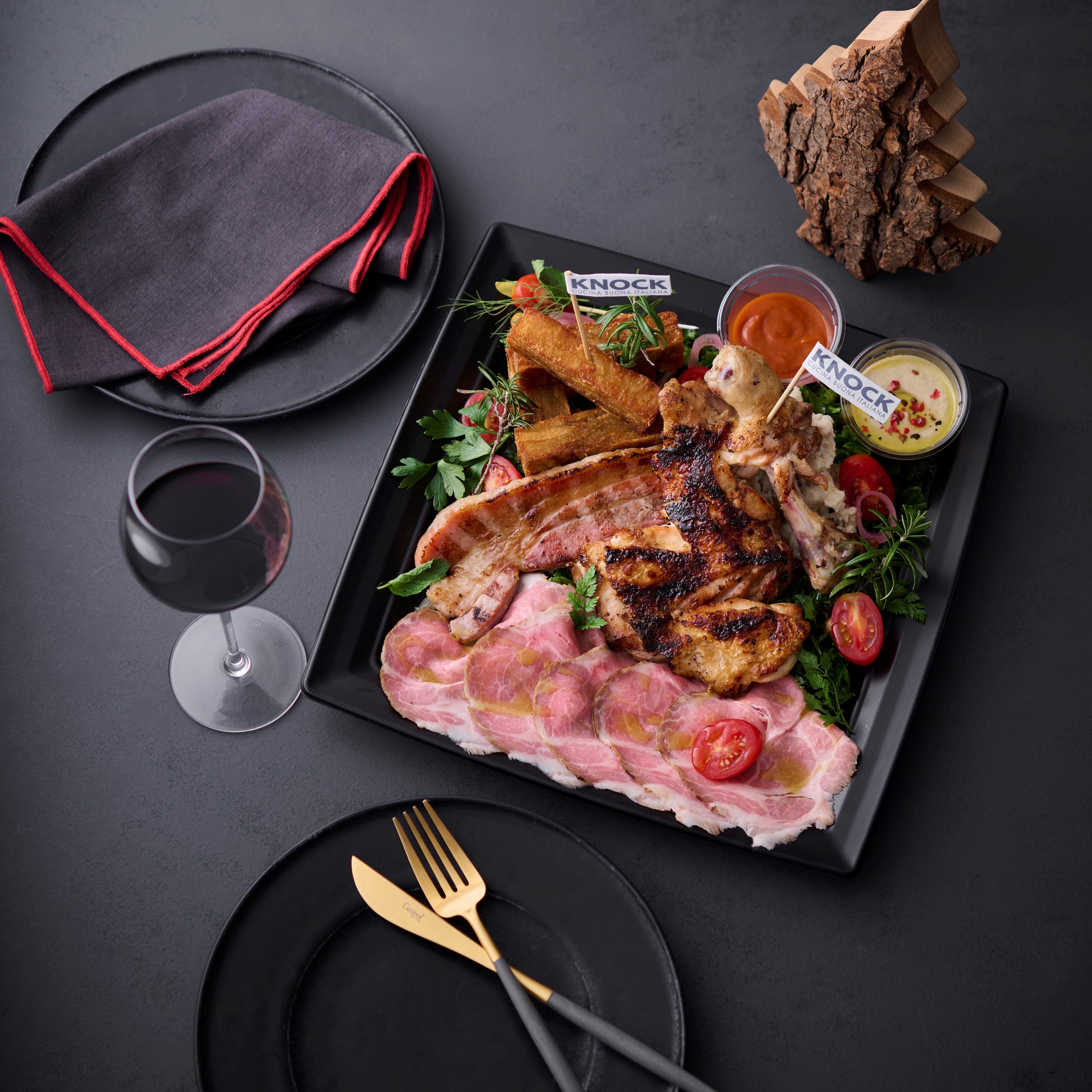 KNOCK名物の肉料理を豪華に盛り合わせました。ジューシーな美桜鶏もも肉グリル、ツナのソースで味わう自家製ポークハム、香り高い厚切りベーコンがどっさり。お子様から大人まで人気のミルフィーユ・フライドポテト、オリーブやアンチョビ入りで風味豊かなポテトサラダもお楽しみいただけます。 販売期間:11月14日(金)~12月25日(木)