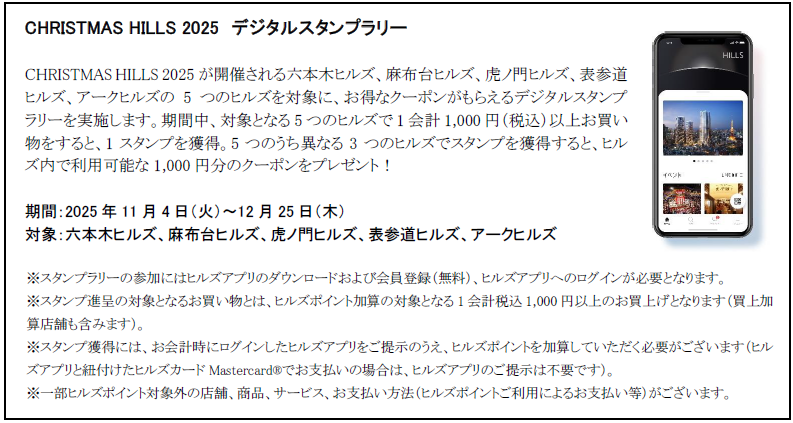 https://prcdn.freetls.fastly.net/release_image/48109/326/48109-326-2bae2fd32e63117f614e85c599c4960c-1407×939.jpg ●Roppongi Hills/Azabudai Hills Christmas Market Digital Stamp Card Earn one stamp per day when you spend 1,000 yen (tax included) or more in a single transaction at the Roppongi Hills or Azabudai Hills Christmas Market! Earn three stamps and receive a ¥500 coupon valid at participating Roppongi Hills or Azabudai Hills stores. Earn five stamps and receive an additional coupon. *To participate in the stamp card, you must download the Hills app, register as a member (free of charge), and log in to the Hills app. *Stamps are awarded for purchases of 1,000 yen or more (tax included) that are eligible for Hills Points. *To earn stamps, you must present the Hills app you’ve logged in to at checkout and have Hills Points added to your account. (If you pay with a Hills Card Mastercard(R) linked to the Hills app, you do not need to present the Hills app.) *Some payment methods are not eligible for Hills Points. *The coupon can be used on purchases of 1,000 yen or more (tax included) from Saturday, January 10, 2026 to Saturday, February 28, 2026. (Cannot be used in conjunction with other coupons.) *Coupons will be distributed via the Hills app. Details on available stores will be provided within the coupon. Christmas Photo Booth by MAZDA Mazda Motor Corporation will be exhibiting a photo booth filled with a Christmas atmosphere. We hope you take some special photos and have a great time. We look forward to seeing you there. Date: November 22nd (Saturday) – December 25th (Thursday) Time: 11:00-21:00 Location: O-Yane Plaza Sponsor: Mazda Motor Corporation