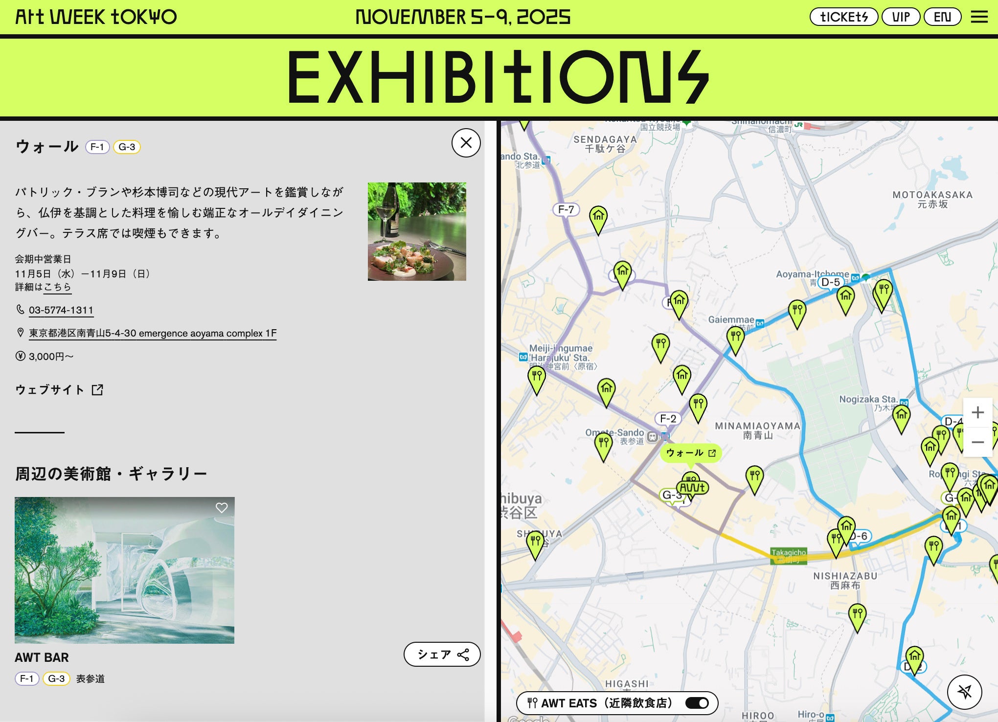 https://prcdn.freetls.fastly.net/release_image/141413/16/141413-16-33777675f9f8bb8df9f236899b3f889e-2040×1476.jpg Click the button at the bottom of the map to view nearby restaurants. https://www.artweektokyo.com/exhibitions/ Event overview Art Week Tokyo Name: Art Week Tokyo (Roman: Art Week Tokyo, abbreviated as AWT) Dates: November 5th (Wed) – 9th (Sun), 2025, 10:00 – 18:00 Venue: Participating art museums and galleries in Tokyo, AWT FOCUS, AWT BAR, and other program venues Organizer: Contemporary Art Platform General Incorporated Association In partnership with: Art Basel Special cooperation: Agency for Cultural Affairs Art Week Tokyo Mobile Project Name: Art Week Tokyo Mobile Project Dates: November 7th (Fri) – 9th (Sun), 2025, 10:00 – 18:00 Organizer: Tokyo Metropolitan Government / Art Week Tokyo Mobile Project Executive Committee 料金 – AWT BUSの乗車無料。 – 参加ギャラリーの入場無料。参加美術館ではAWT会期中に限り所定の展覧会にてAWT特別割引適用。 – AWT VIDEO、AWT TALKSのプログラム参加無料 – AWT
