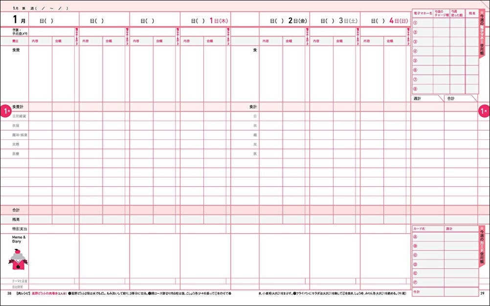 https://prcdn.freetls.fastly.net/release_image/2372/2712/2372-2712-c56434ed16ede5a951934763f3911ebc-1002×626.jpg – Plenty of space for electronic money and credit card information, making cashless payments easy to manage. – You can customize the app by setting expense categories that are easy to use, changing the start of the month to “payday,” and more. – The free-form entry section is perfect for keeping a diary or to-do list. – The margins include one-line recipes for saving time and money. <Monthly Summary Page>