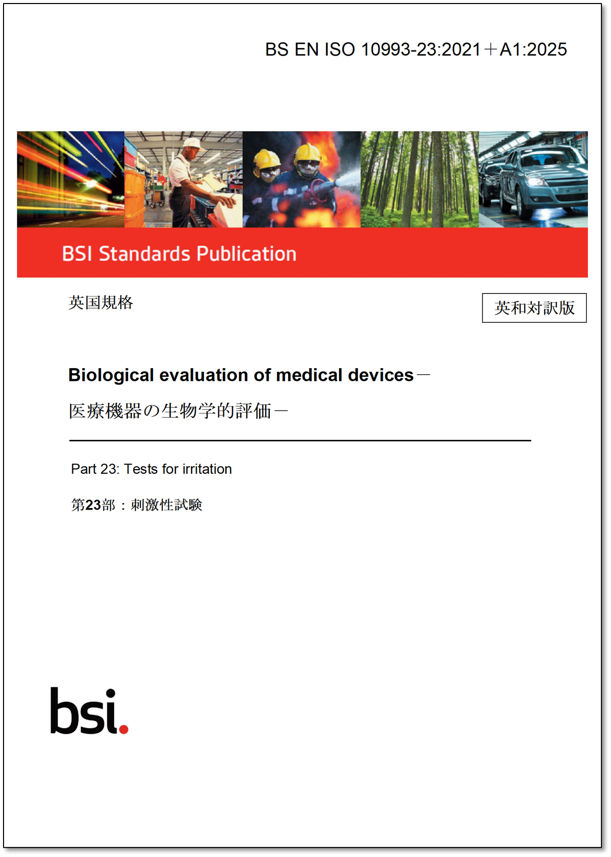 https://prcdn.freetls.fastly.net/release_image/4052/467/4052-467-7fcc0a4c0bd241fc3c3df0f6dbfcb30a-1209×1697.png BS EN ISO 10993-23:2021 A1:2025 Biological evaluation of medical devices – Part 23: Irritation tests Biological evaluation of medical devices – Tests for irritation 《English》Price including tax: 79,860 yen, A4 size, 78 pages 《Japanese translation (English/Japanese)》Price including tax: 111,804 yen, A4 size, 154 pages This standard provides a framework for evaluating the potential risk of irritation, such as inflammation or redness, when a medical device comes into contact with body tissues, such as the skin, mucous membranes, or eyes. Click here for purchase and details Purpose of BS EN ISO 10993-23:2021 By promoting the latest scientifically valid testing methods, this standard enables the efficient and ethical evaluation of medical device safety using data that is more easily extrapolated to humans, while taking animal welfare into consideration. Information on related standards ▼Standard information