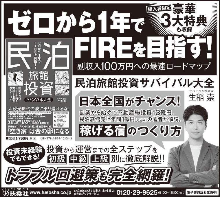 Fusosha Publishing Co., Ltd. Press Release: October 22, 2025 To Members of the Press Special shelves available at major bookstores nationwide! “The Complete Guide to Investing in Minpaku Inns and Hotels” (by Takashi Ikuina) is a hot topic—with an unprecedented promotional campaign including an advertisement in the Nihon Keizai Shimbun newspaper and pre-publication events. Fusosha Co., Ltd. has released “The Complete Guide to Investing in Minpaku Inns and Hotels and Hotels” (by Takashi Ikuina), a book packed with know-how for realizing a side income through the minpaku and hotel business, aiming to “go from zero to FIRE in one year.” (author) was released on October 1, 2025.