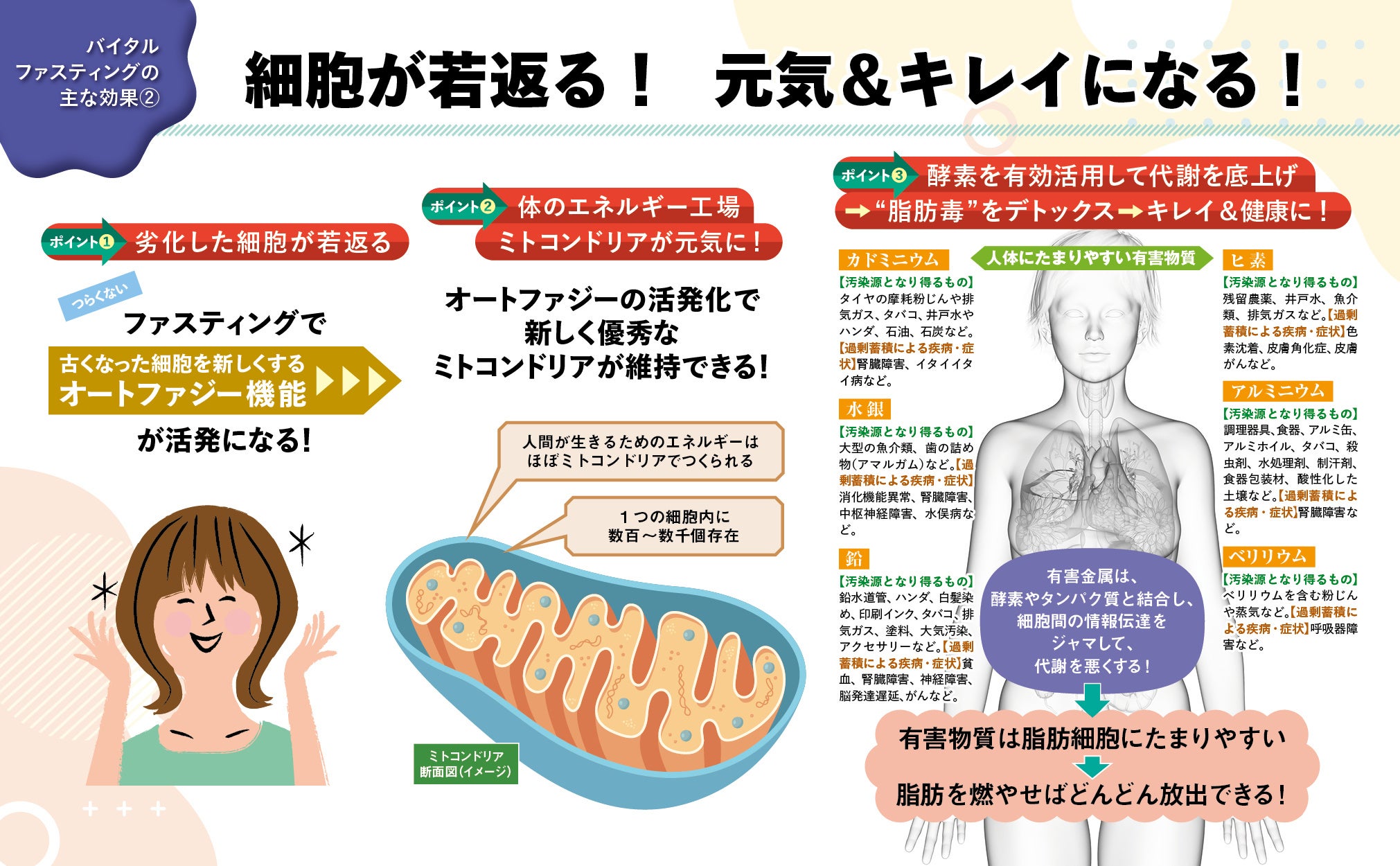 Association. Based on nearly one million successful fasting attempts, the method boasts a high success rate and sustainability, and is known for harmonizing not only the body but also the mind. When it comes to typical fasting, the image of “fasting (negative food)” as a way to combat painful hunger is strong, but Vital Fasting isn’t just about negative aspects. It also approaches the body from positive aspects, such as “taking in the nutrients and fluids your body needs” and “learning about foods that will delight your cells (food education).” This is a practical and integrative method that solves the problems faced by modern people, such as physical and mental discomfort, poor lifestyle habits, and excessive stress, and achieves a state of physical and mental fulfillment known as “well-being” at the cellular level. Vital Fasting is a unique three-phase program that allows you to rest your internal organs and brain and reset your cells through three phases: “Food Plus/Minus” and “Mental Plus/Minus.” Furthermore, we will improve your metabolism and intestinal environment, and even organize your thoughts and emotions to restore balance to your mind and body and your true self.