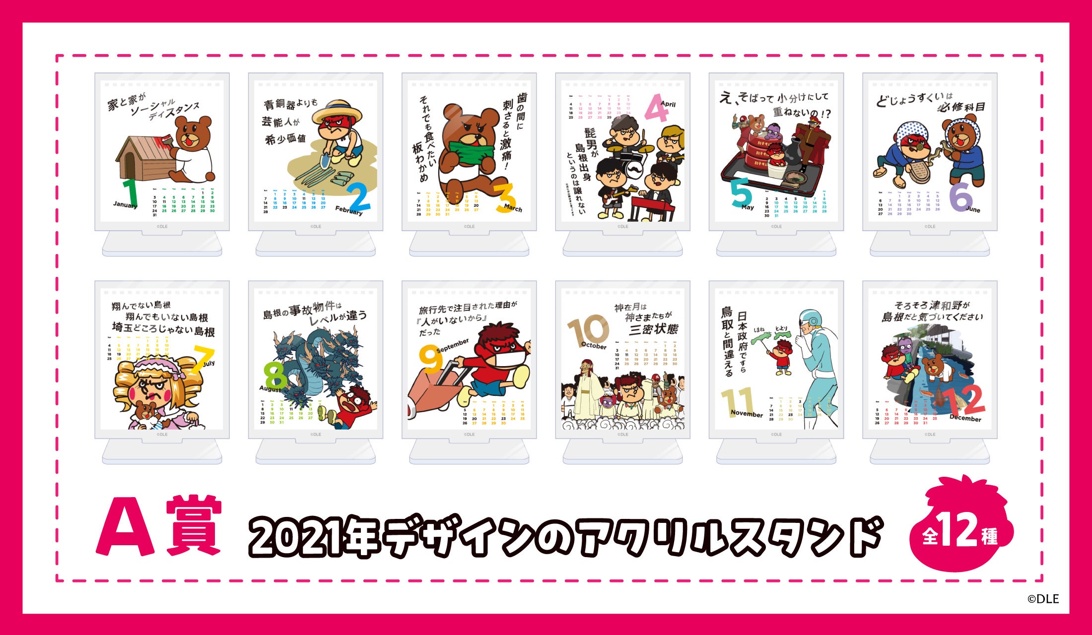 https://dle-kuji.dle.jp/lotteries/takanotsume_jigyaku01 For this lottery, the designs of the “Shimane Self-Deprecating Calendar” from 2021 to 2024 have been perfectly reproduced as miniature acrylic stands. This is a unique attempt to reuse past self-deprecating humor that has outlived its usefulness as a calendar. There are 30 types of lottery tickets with no losing tickets, and bonuses are also available depending on the number of tickets purchased. ■What is the “Eagle Talon x Shimane Self-Deprecating Calendar”? The “Eagle Talon x Shimane Self-Deprecating Calendar” was first released in 2011 and sparked the “local self-deprecating” trend. It was featured on Nippon Television’s “Monday Late Night” and “Sukkiri!!” and Fuji Television’s “Tokudane!” shortly after its release, becoming a desk calendar that is enduringly popular not only in Shimane Prefecture but nationwide, with cumulative sales exceeding 100,000 copies. Every year, we introduce things unique to Shimane with self-deprecating copy and illustrations of the Eagle Talon gang. This year’s calendar, “Eagle Talon x Shimane”