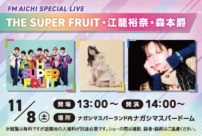 [FM Aichi Co., Ltd.] FM AICHI public recordings will be held at Nagashima Spa Land on November 8th and 9th! “THE SUPER FRUIT,” “Ego Yuna,” and “Morimoto Shaku” will appear on the 8th, and “KID PHENOMENON” will appear on the 9th!