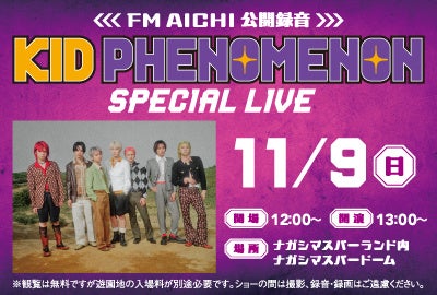 https://prcdn.freetls.fastly.net/release_image/36704/616/36704-616-243a822b636f8b46a751e83807b99638-400×270.jpg Title: FM AICHI Public Recording KID PHENOMENON SPECIAL LIVE Date and Time: Sunday, November 9, 2025, Doors Open at 12:00 (Scheduled) / Show Starts at 1:00 PM (Scheduled) Venue: Nagashima Spa Land “Nagashima Spa Dome” Special Stage Guest: KID PHENOMENON Event MC: Yuhei Shigeta (FM AICHI personality) Advance ticket prices: Adults (junior high school students and older) ¥1,800 / Elementary school students ¥1,100 / Infants (ages 2 and older) ¥600 *This includes Nagashima Spa Land admission and priority seating for the event. *Advance tickets are limited to 1,100. Event homepage (FM AICHI):