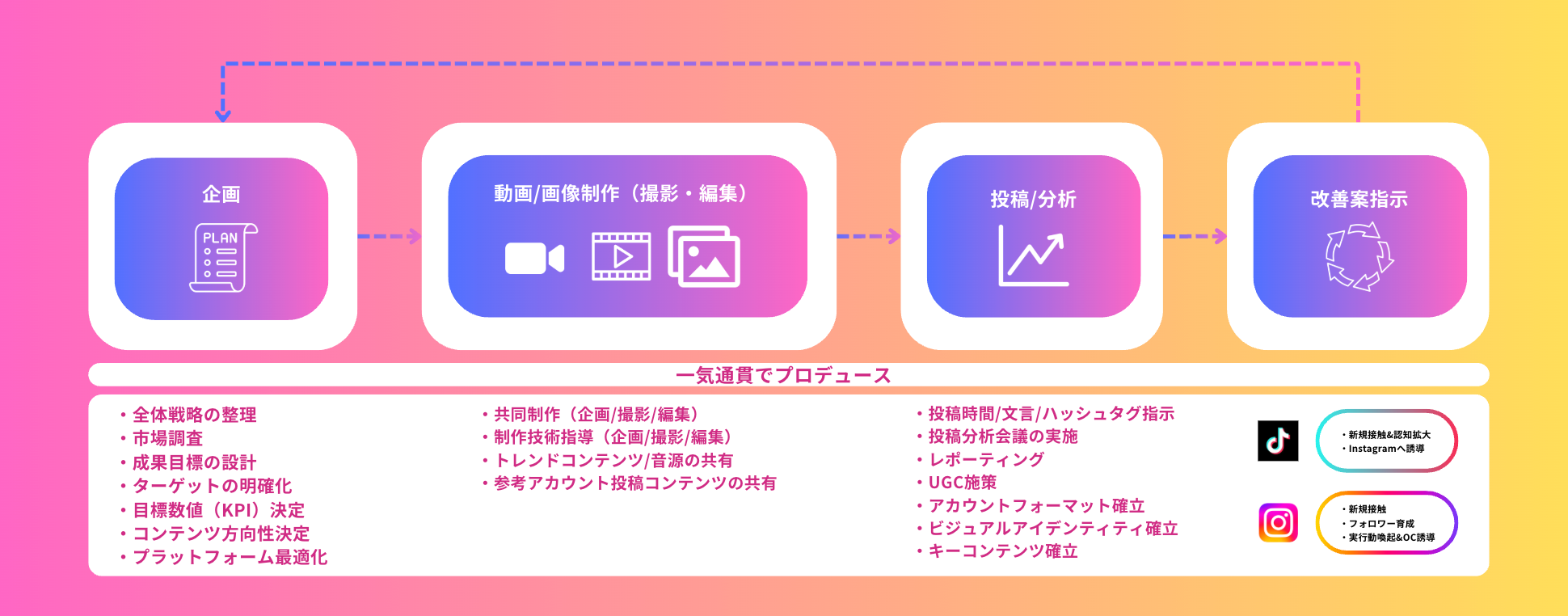 https://prcdn.freetls.fastly.net/release_image/120928/18/120928-18-b8560319c9d703f93532e2987b300d89-1940×762.png Based on our experience in managing social media accounts, we have established a one-stop operational system that handles everything from planning → production (shooting and editing) → posting/analysis → improvement suggestions. We start with market research and KPI design, then collaborate with talent to create content optimized for the platform’s characteristics. After posting, we conduct data-based reporting and improvement meetings, and rapidly implement the PDCA cycle to ensure consistent results from the start. In addition, we will establish the account format, visual identity, and key content, and also design UGC. We will implement “Like to Join to Meet Marketing” (our proprietary talent marketing method) as a standard feature, aiming to increase new connections and awareness on TikTok, and to cultivate followers and convert them into action (visits, purchases, applications, etc.) on Instagram. By making good use of social media, we are able to produce talent from scratch, something that traditional talent agencies have been unable to do. We also help influencers whose growth has slowed get a fresh start. Under the vision of “creating opportunities for those who have nothing to have something,” We turn the unrealized dreams of young people into reality. About Rainbows, Full Moons, and Co., Ltd.