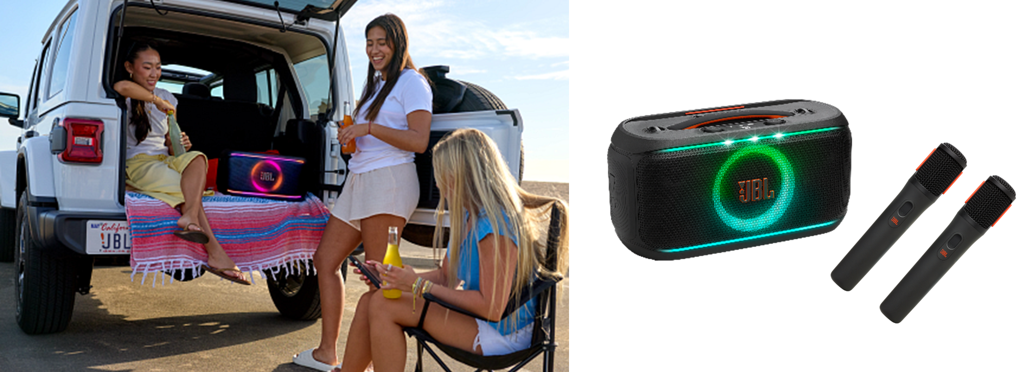 weekender-style portability, an ergonomic handle, and IPX4*2 splash resistance for peace of mind in case of sudden rain, allowing you to enjoy them anywhere. The series also features a vibrant lighting function that changes in time with the music’s beat, allowing you to enjoy music visually. Using the “JBL PARTYBOX” app, you can customize your preferred color palette from a 65,000-color palette and lighting patterns to suit the occasion, mood, and music, creating a space that suits your taste. Enjoy powerful sound anywhere with the JBL PartyBox On-The-GO 2, making your active life even more enjoyable. Product points ● Enjoy powerful JBL pro sound with a maximum output of 100W that exceeds its size ● Includes two high-quality digital wireless microphones that capture your voice without picking up ambient noise ● Includes a smart key change function and echo for a more comfortable key to sing in ● Achieve up to 15 hours of playback time with a large-capacity, replaceable battery. ● Supports fast charging, allowing approximately 80 minutes of playback with a 10-minute charge. ● Equipped with “AI Sound Boost,” which adjusts the speaker in real time to deliver clear, powerful sound. ● Ergonomic handle for easy portability and shoulder strap to reduce shoulder strain ● Auracast compatible, wirelessly connect to multiple compatible devices with one touch ● IPX4-rated*2 splash-resistant for safe use outdoors and near water ●Designed with sustainability in mind, using recycled plastic