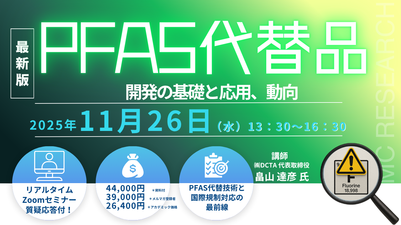 CMC Research Press release: October 23, 2025 To Members of the Press [Livestream/ZOOM] Seminar on “Fundamentals, Applications, and Trends in the Development of PFAS Alternatives” will be held! November 26th (Wednesday) Sponsored by: CMC Research, Inc. ★As PFAS regulations become stricter worldwide, take a bird’s-eye view of alternative technologies and national responses. Learn about the latest research trends and practical solutions, including the ePTFE issue and water quality analysis!