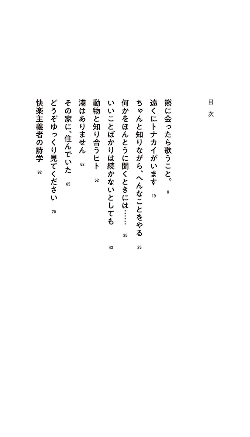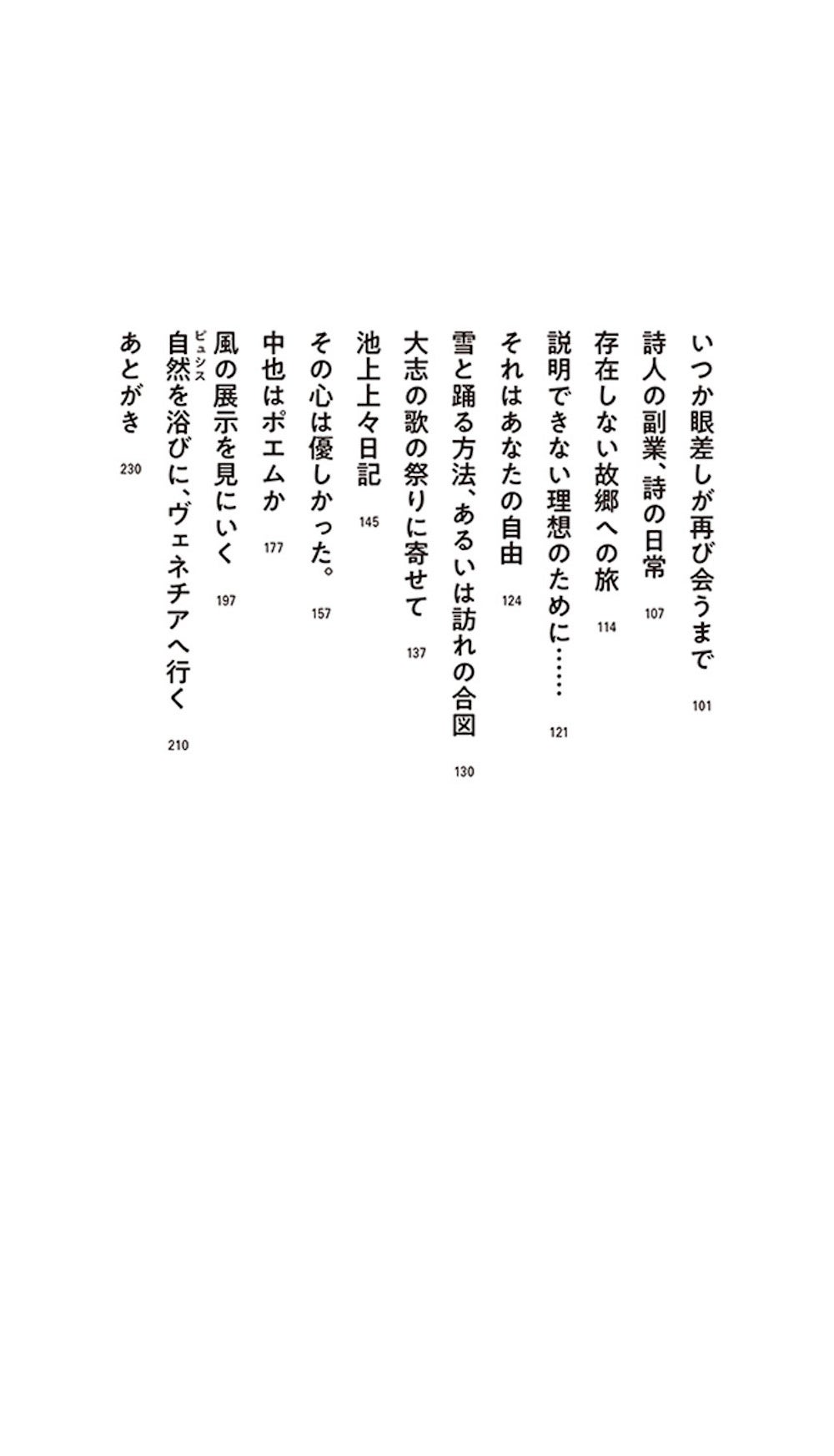 travelogues, diaries, and contributions to film and art. From his original debut work to his latest work, this writer, currently enjoying a breakthrough, has written about animals, movies, children’s literature, life, travel, and poetry over the past decade. Take a look at the trajectory and current state of his words. [Places that appear in this work] Deep in the mountains among bears, the Shonan seaside, the Noto Peninsula after the earthquake, the Hansen’s Disease Museum, the Toyota Municipal Museum of Art, Venice, and literature, film, and art from ancient times to the present, etc. “Even if good things don’t last forever, we must remain light-hearted, cheerful, and hopeful. (…) No matter how bad things seem, we can find something new and interesting. We can begin the great task that awaits us. We can no longer return to being children with infinite possibilities; we can open up the world as adults. If we can’t speak English, we can speak in Japanese. If we can’t become noble wild animals, we can find a way to survive as strange animals called humans.” (From the text) ●Table of Contents for “Even if All Good Things Don’t Last” Sing when you meet a bear. There’s a reindeer in the distance. Knowing it all, yet doing strange things. About the world of Moomin. When you really listen to something…. About Michael Ende’s “Momo.” Even if good things don’t last forever. Wes Anderson’s animals. People who get to know animals. About the photographs of Iwago Mitsuaki. There’s no harbor. The people who lived in that house. Please take your time to look at it. Another earthquake diary. The poetics of a hedonist. About Tanikawa Shuntaro. And Until our eyes meet again one day – About “Portrait of a Lady on Fire” A poet’s side job, the daily life of poetry – About “Paterson” A journey to a home that doesn’t exist – About “Million Dollar Baby” For an ideal that cannot be explained… – About “The Tree-Climbing Baron” It is your freedom – About “Goodbye, Language of Love” How to dance with the snow, or the signal of your arrival – About the film “Shari” In memory of the Ambition Song Festival – To Professor Anno Mitsumasa Ikegami Ueue Diary His heart was kind. The day I met the poets of “The Buds of Life” Is Nakahara poetry? Collaborating with the public Visiting the Wind Exhibition Going to Venice to soak up nature
