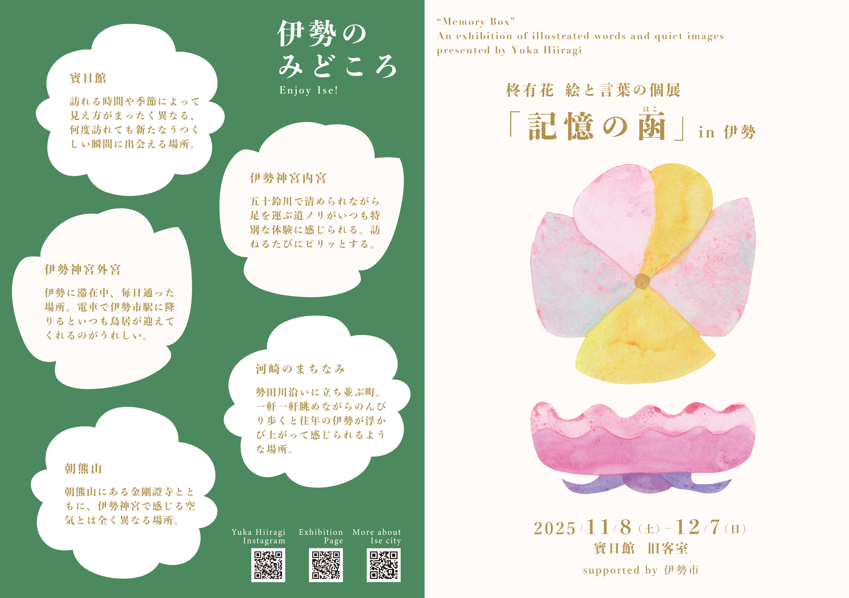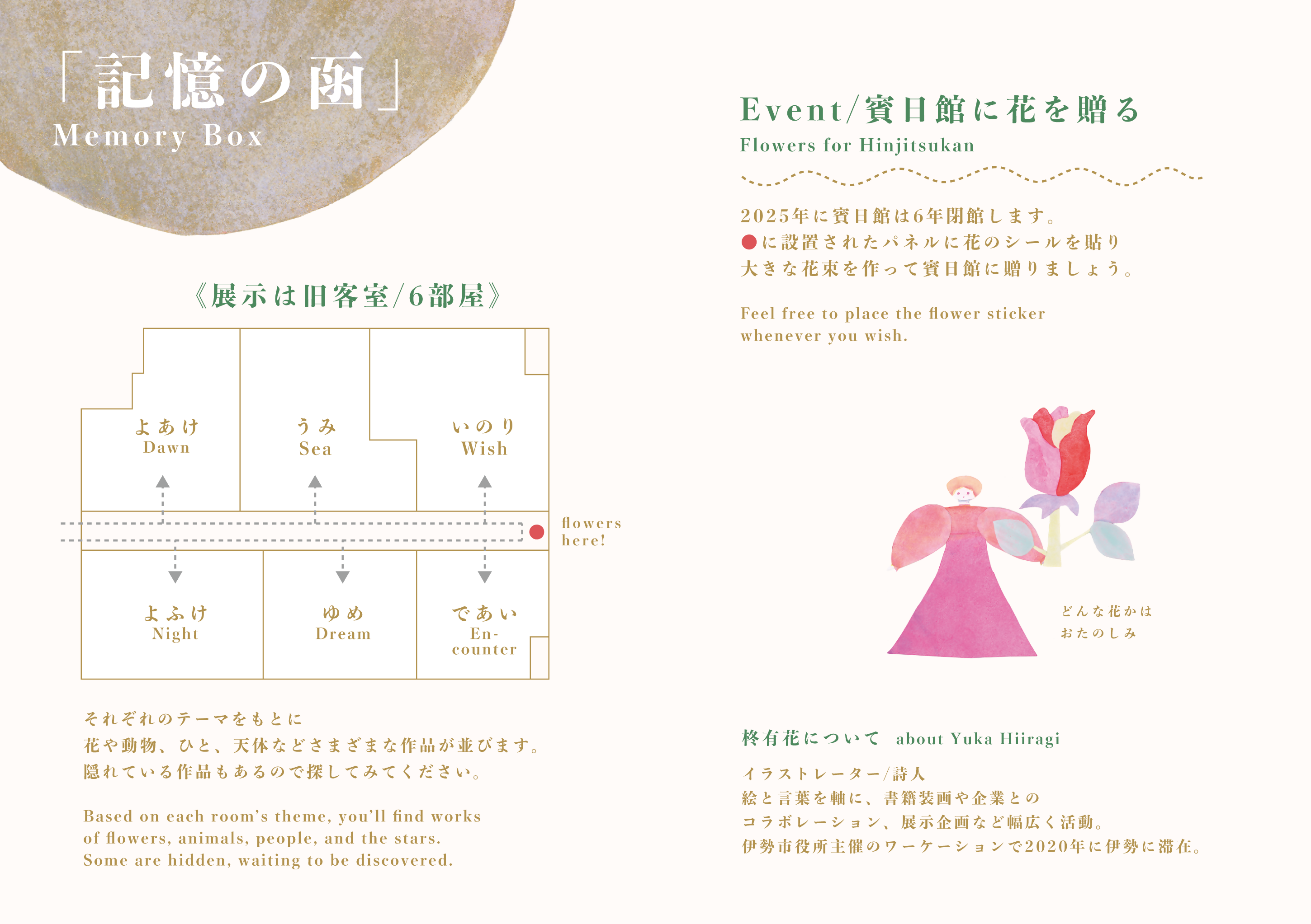Ise City Press release: October 23, 2025 To Members of the Press Illustrator Yuka Hiiragi to hold solo exhibition at the Binjitsukan, a nationally designated important cultural property in Ise City! ~Yuka Hiiragi’s solo exhibition of paintings and words, “Box of Memories” in Ise~ This is a special one-month-only exhibition featuring original paintings and poems by Hiiragi, who stayed in Ise on a creators’ workation in 2020. The exhibition is based on her time in Ise. You can enjoy a journey-like experience, starting in the “Dawn” room and ending in the “Yofuke” room. In conjunction with this exhibition, we will be holding a special event, “Send Flowers to the Binjitsukan,” in which visitors will create a bouquet together and present it to the Binjitsukan, which will be temporarily closed at the end of fiscal year 2025 for renovations. Please feel free to visit the exhibition while sightseeing in Ise.
