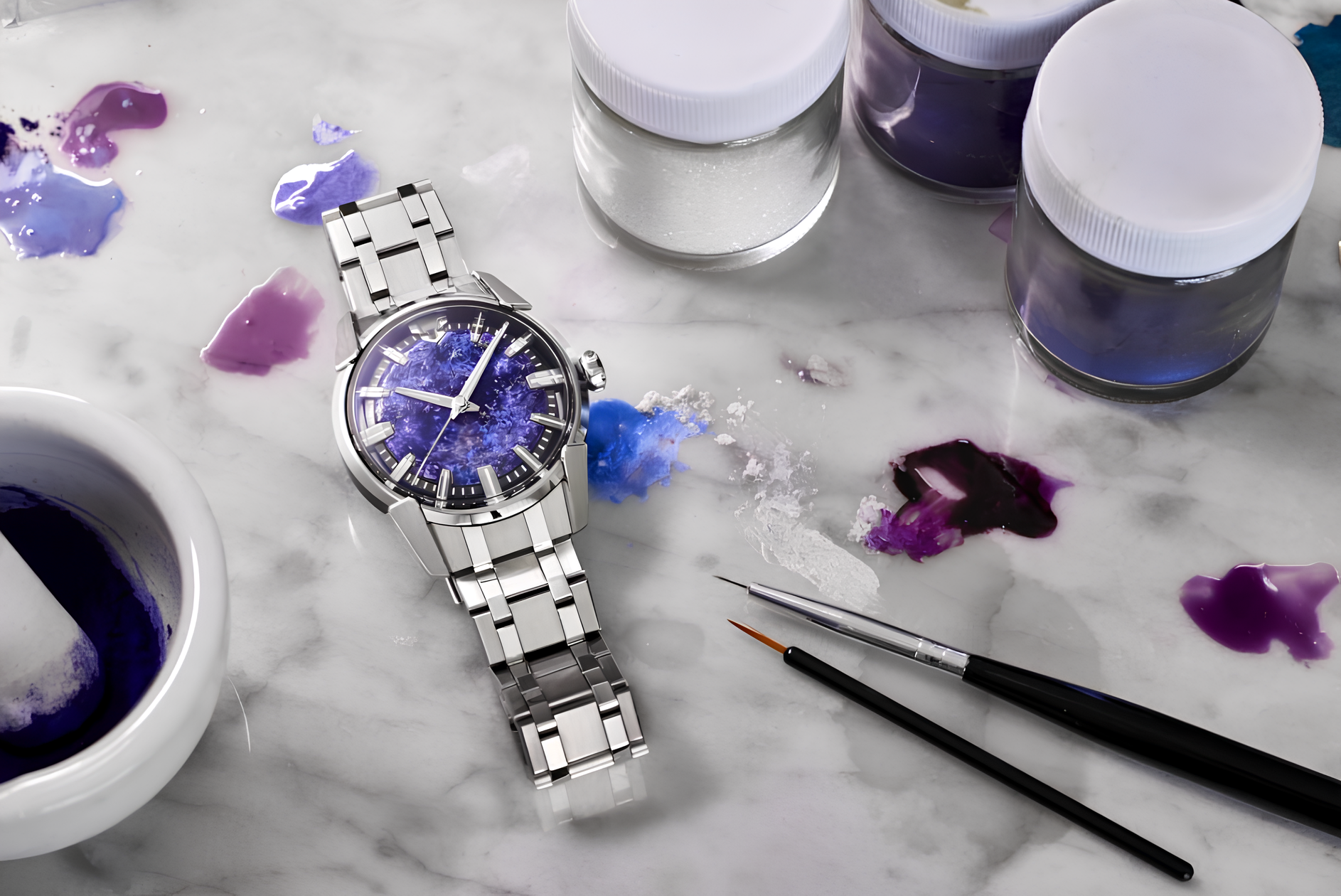“multi-layeredness” inherent in color itself. Colors reflect the moment they are exposed to light and change appearance moment by moment depending on the viewing angle and environment, embodying the “aesthetics of fluctuation” that only time can bring about. The “Yusai Dial” is a phenomenal piece of art that allows you to experience the invisible richness hidden within time through the fantastical fluctuations of light and color. When this work of art is placed inside a watch case that emits the exquisite brilliance of MINASE’s world-renowned Zaratsu polishing, it goes beyond mere timing and reaches completion as a magnificent “art of time” that embodies time itself. A New Perspective for Artists and Viewers By bestowing a “new perspective” on viewers and entrusting both viewers and artists to the plateau of the vast world, and by fusing contemplation and physics, a space for mutual exploration in the absence of the artist and viewer is created in the small microcosm of the dial. Yusai Dial Series (APAN ART COLLECTION)