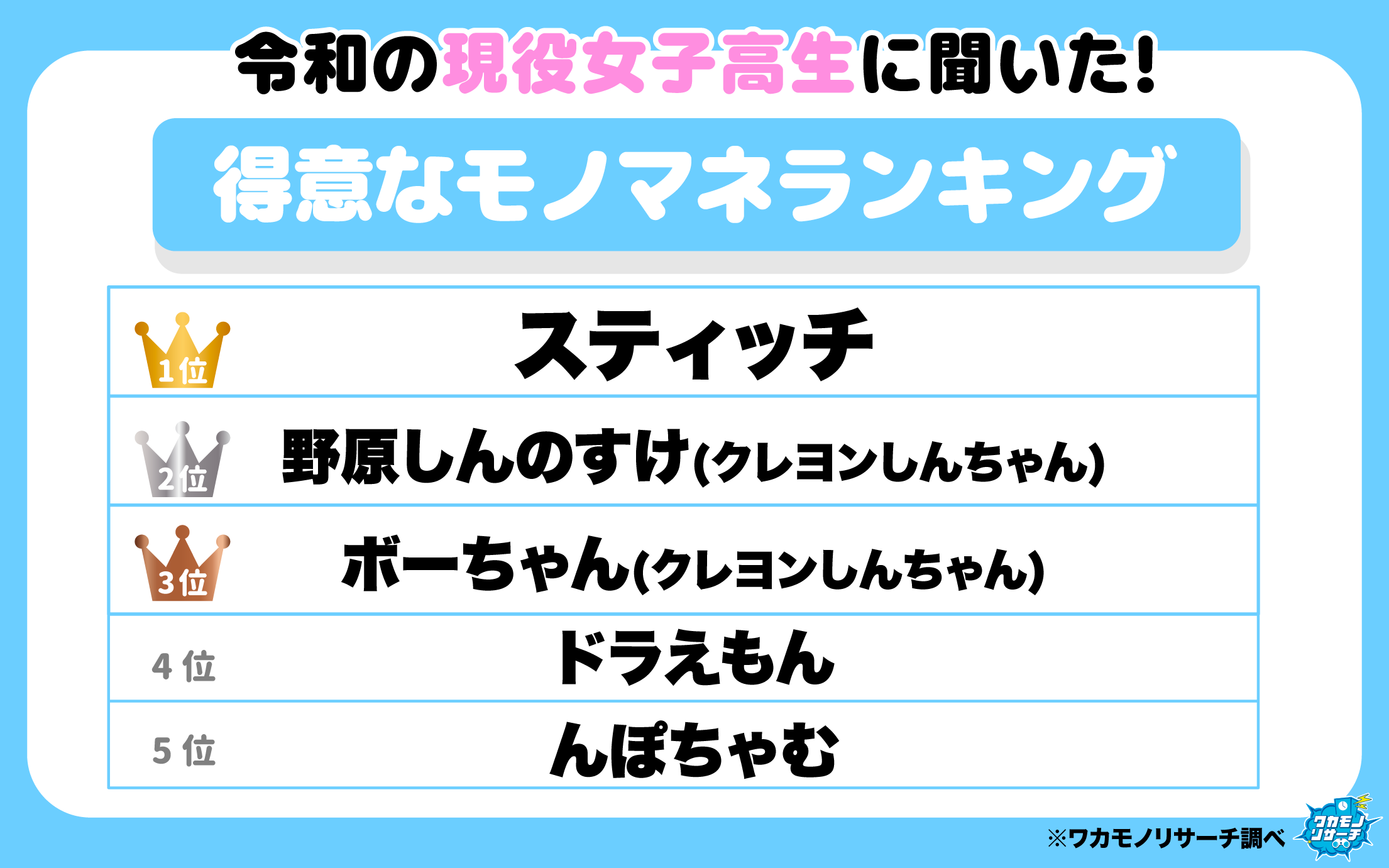 https://prcdn.freetls.fastly.net/release_image/162122/92/162122-92-8a7d87a213a6c44bd7e0714355adfd11-2210×1381.png We asked these high school girls, who are skilled at impersonations, “What is your best impersonation?” and The results were ranked, and The honorable first place went to “Stitch.” Many high school girls are Disney fans, so if you can do an impersonation, it’s sure to get the crowd excited. In second place is Nohara Shinnosuke from Crayon Shin-chan, In third place is Bo-chan from Crayon Shin-chan. Both have unique voices, making them easy to imitate. Also, the top three imitations all have “low voices,” so It may be that low voices are surprisingly easier to imitate than high voices. Also, “Doraemon” ranked fourth. Currently, Doraemon’s voice actor is Mizuta Wasabi, but Apparently, there were high school girls who imitated the previous Doraemon voiced by Oyama Nobuyo. Ranked fifth is “Npochamu”. This character was created by illustrator “Kaasanini!” It’s become a hot topic on YouTube and social media. His unique high-pitched voice is relatively easy to imitate, which is why he made it into the top 5. [High school girls who don’t have any good impersonations say it’s “difficult” and “embarrassing”] 65.5% of high school girls answered that they don’t have any good impersonations, “Impersonations are difficult and I can’t do them.” “I don’t do them because I’m embarrassed.” They don’t try impersonations because they feel it’s “difficult” or “embarrassing,” As a result, we received feedback that he doesn’t have any good impersonations. Also, “Because I haven’t done many impersonations.” “Because I don’t have any opportunities to do impersonations.” Some people say that they don’t have the environment to do impersonations in the first place, and “Because I’m a terrible impersonator.” “Because I’m not good at impersonations.” “I know my impersonations won’t be funny.” They try, but they’re so “unlike” that they end up giving up. It seems that many high school girls felt that it was not something they could show off in public. “Because I’m not funny” “Because I don’t have the sense to make people laugh” There are also high school girls who are aware that their own personalities and positions mean they are “not the type of person to do an imitation.” It also appears that the majority of high school girls who aren’t good at impersonations are “the type who don’t do impersonations in the first place.” It appears that the majority of high school girls who aren’t good at impersonations are “the type who don’t do