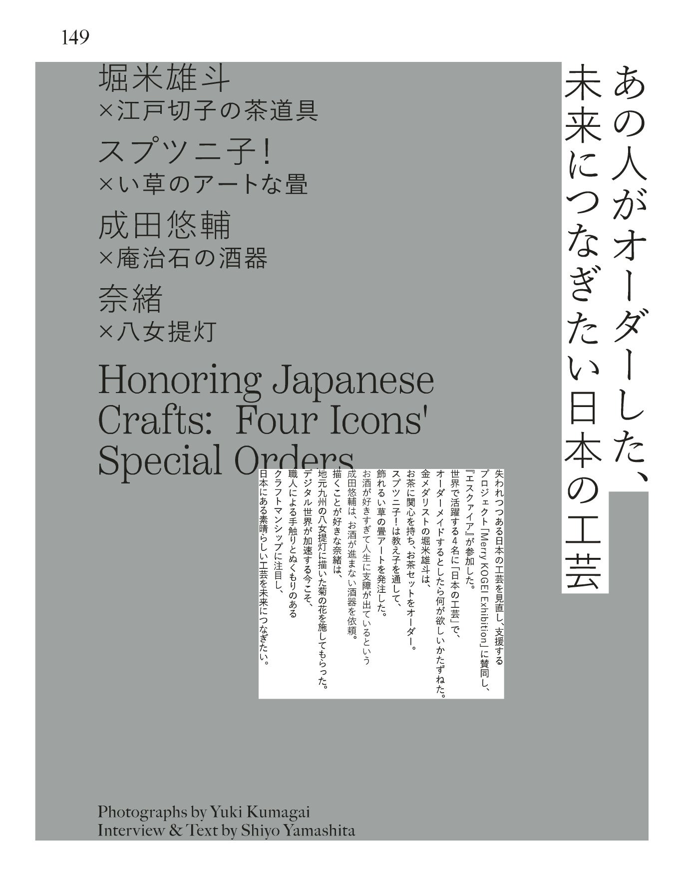 https://prcdn.freetls.fastly.net/release_image/8128/836/8128-836-25cfb13464453d3a9e9ace7d1587a190-1370×1754.jpg Japanese crafts ordered by famous people, that we want to pass on to the future “Merry KOGEI” project aims to rediscover and support Japanese crafts that are on the verge of disappearing. Esquire participated in the “Japanese Crafts Exhibition” in support of the event. Four internationally active individuals were asked what they would like to have custom-made in the “Japanese Crafts” category. Gold medalist Horigome Yuto, interested in tea, ordered a tea set. Sputniko! commissioned a decorative rush tatami art piece designed by one of his students. Narita Yusuke, who says his love of alcohol is interfering with his life, requested a sake cup to help him drink less. Nao, who loves to draw, had chrysanthemum flowers painted on a Yame lantern from her hometown of Kyushu. Now, as the digital world accelerates, it is time to focus on the tactile and warm craftsmanship of artisans, and connect Japan’s wonderful crafts to the future. In addition, the custom crafts created by the four artists through this project will be exhibited at the “Merry KOGEI Exhibition,” an event held at Tokyo Midtown Yaesu as part of “MIDTOWN YAESU CHRISTMAS 2025,” from Thursday, November 13th to Thursday, December 25th. The exhibition will feature an exhibition of craft works by approximately 60 groups, a craft market every weekend for six weeks, demonstrations where you can experience the skills of artisans, workshops, and more. Set in Yaesu, a town that has flourished as a “town of craftsmanship” since the Edo period, this special Christmas event will combine the beauty of handcrafts woven by modern artisans with the skills of various regions of Japan. MIDTOWN YAESU CHRISTMAS 2025 Period: November 13th (Thursday) to December 25th (Thursday), 2025 Location: Tokyo Midtown Yaesu 1F Galleria/Atrium