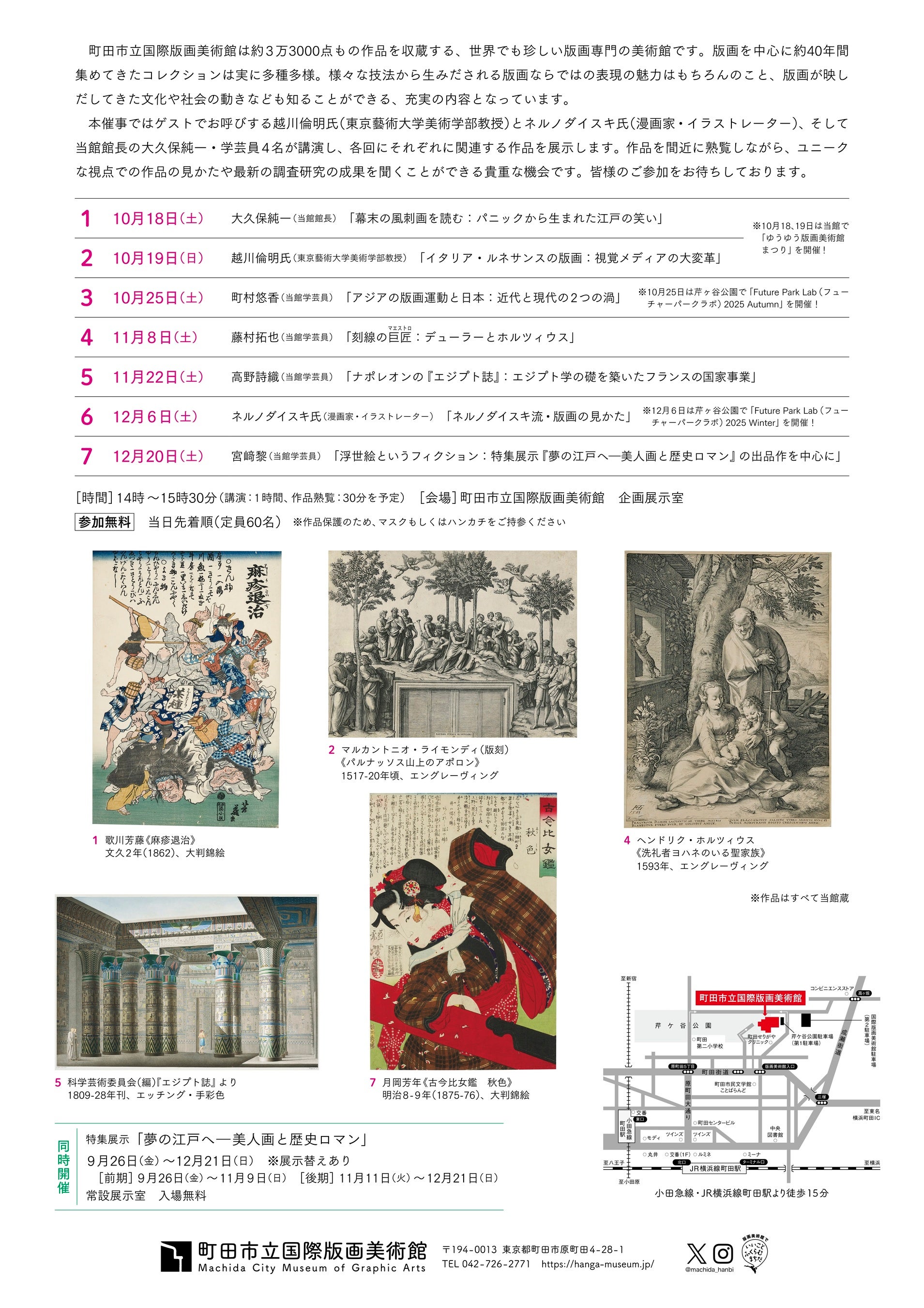 perspectives, and hear about the latest research findings. We look forward to your participation. Date and time *All times are from 2:00 PM (doors open 30 minutes before) to 3:30 PM. 1. Saturday, October 18th Junichi Okubo (Director of the Museum) *Finished “Reading Satirical Cartoons from the End of the Edo Period: Edo Laughter Born from Panic” 2. Sunday, October 19th Mr. Tomoaki Koshikawa (Professor, Tokyo University of the Arts)※Finished “Italian Renaissance Prints: Revolutionizing Visual Media” 3. October 25th (Saturday) Yuka Machimura (Curator) “Asian Printmaking Movements and Japan: Two Vortices of Modern and Contemporary Art” 4. November 8th (Saturday) Takuya Fujimura (Curator) “Masters of Engraving: Dürer and Goltzius” 5. November 22 (Saturday) Shiori Takano (Curator) “Napoleon’s ‘Egyptia’: The French National Project that Laid the Foundation for Egyptology” 6. December 6th (Saturday) Mr. Nerunodaisuki (Manga Artist/Illustrator) “Nelno Daisuki’s Way of Looking at Prints” 7. Saturday, December 20th Rei Miyazaki (Curator) “Ukiyo-e as Fiction: Focusing on Works Exhibited in the Special Exhibition ‘Dreamy Edo – Bijin-ga and Historical Romance'” Participation fee Free Capacity 60 people on a first-come, first-served basis Venue Machida City Museum of Graphic Arts, Special Exhibition Room Official website: