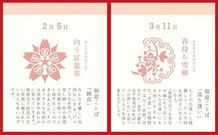 https://prcdn.freetls.fastly.net/release_image/13389/715/13389-715-09c978c0df8fb36bd82500d56d218c0e-749×541.jpg Each of the 366 days (365 days February 29th in leap years) has its own unique meaning (individual word), such as “innocence” or “encounter.” On the dedicated website, you can enter your birthday to see your own individual flower crest and individual word, and you can also enjoy a free, simple personality test.