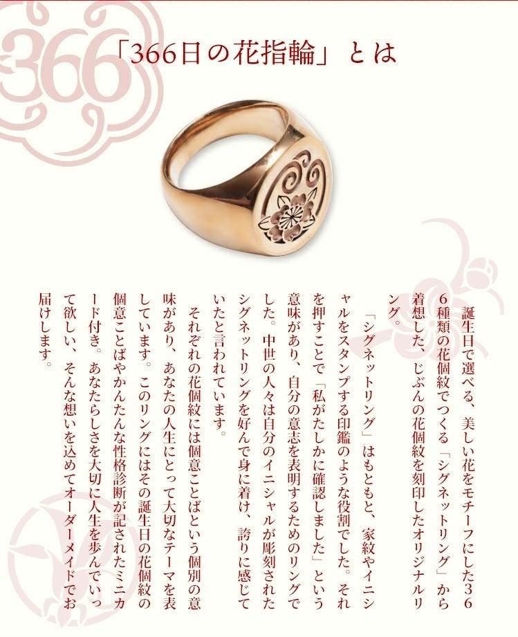https://prcdn.freetls.fastly.net/release_image/13389/715/13389-715-eef248565d7bd89650bb9069eb31a293-749×498.jpg The “366 Days Flower Ring” is a modern take on the signet ring, which became an essential item when 14th-century King Edward II of England decreed that “all official documents must be sealed with the King’s Seal Ring.” We aim to continue creating stamps that blend into everyday life and bring smiles and spark communication every time you use them. 366 days flower ring