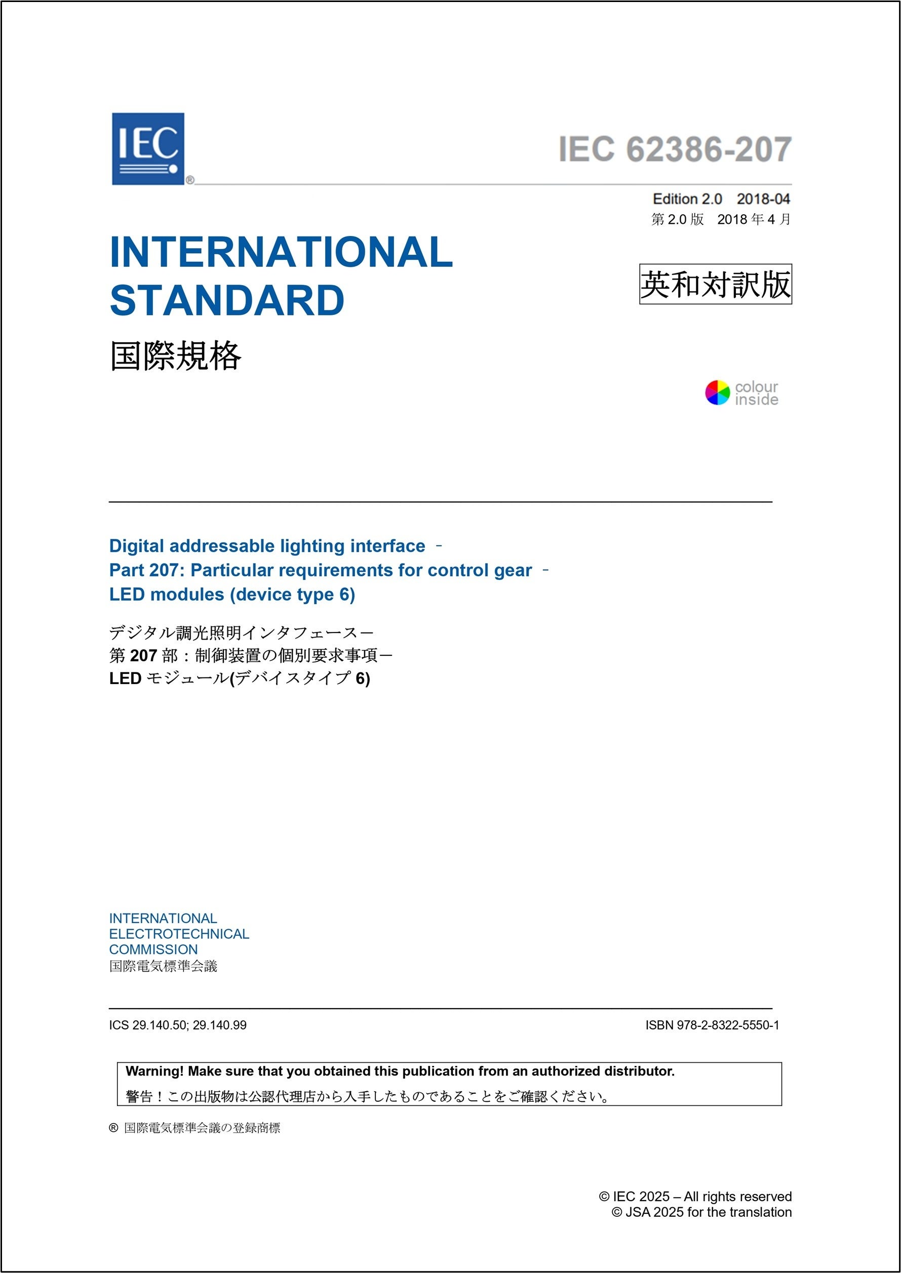 https://prcdn.freetls.fastly.net/release_image/4052/469/4052-469-0d96e4da561388d0e5d0c69ed90e2be4-1779×2514.jpg IEC 62386-207 Ed. 2.0:2018 (b) Digital addressable lighting interface – Part 207: Particular requirements for control gear – LED modules (device type 6) Digital addressable lighting interface – Part 207: Particular requirements for control gear – LED modules (device type 6) 《English》Price: ¥32,395, A4 size, 41 pages 《Japanese Translation (English/Japanese)》Price including tax: ¥58,311, A4 size, 46 pages This standard specifies a bus system for the digital control of electronic lighting equipment with added DC current, in accordance with the requirements of IEC 61347. Click here for purchase and details You can check the latest list of standards on Webdesk. Click here for the latest standards list *Prices of specifications may change. Thank you for your