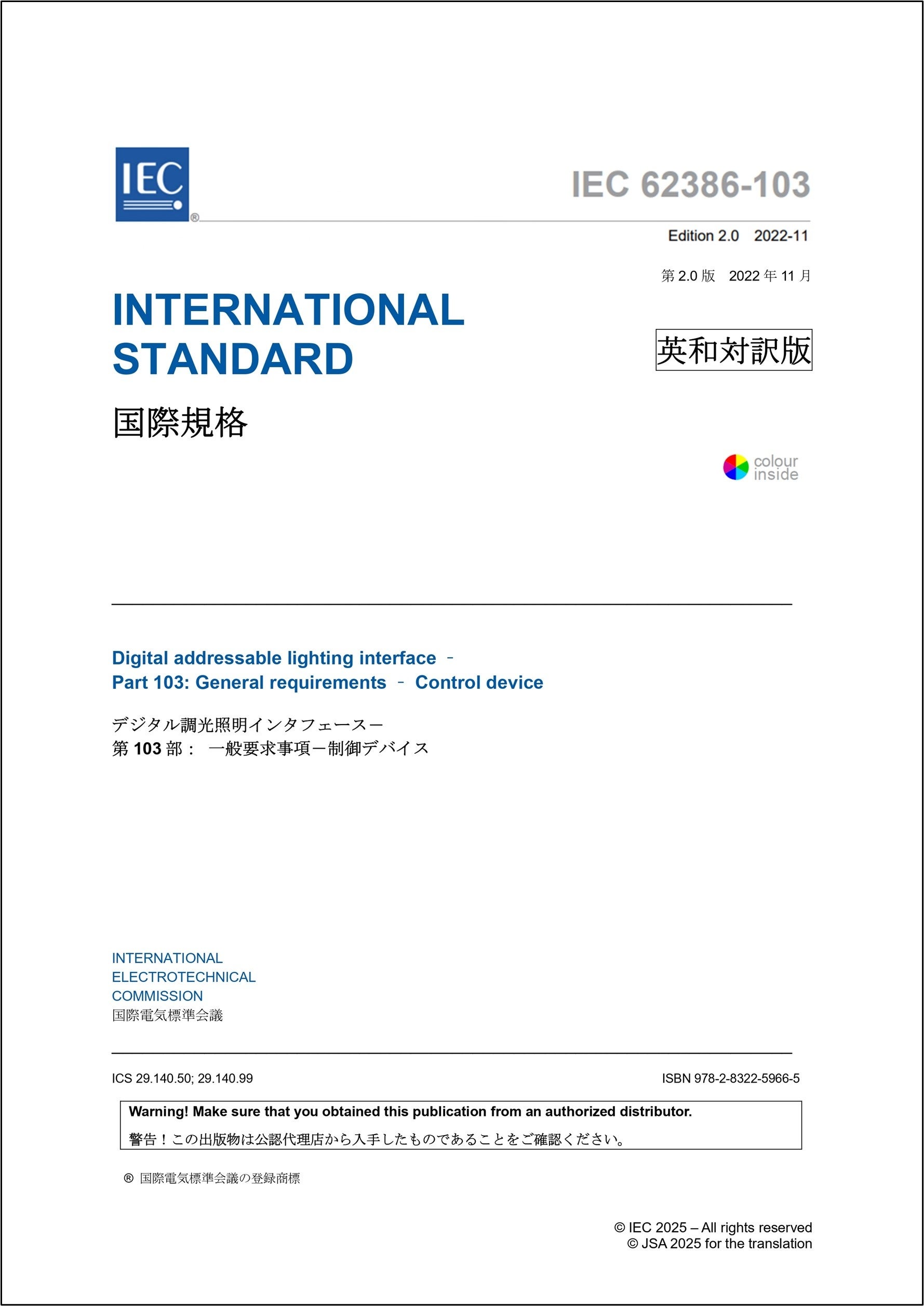 https://prcdn.freetls.fastly.net/release_image/4052/469/4052-469-3eecf1b6a3bfc987f2725ec0615ac943-1779×2514.jpg IEC 62386-103 Ed. 2.0:2022 (b) Digital dimming lighting interfaces – Part 103: General requirements – Control devices Digital addressable lighting interface – Part 103: General requirements – Control devices 《English》Price including tax: 76,285 yen, A4 size, 145 pages 《Japanese translation (English/Japanese)》Price including tax: 137,313 yen, A4 size, 146 pages This standard specifies general requirements for control devices. Click here for purchase and