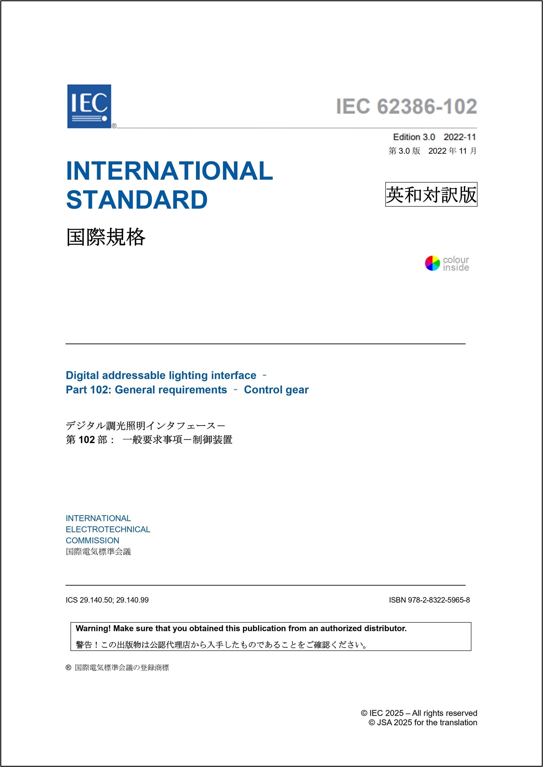 https://prcdn.freetls.fastly.net/release_image/4052/469/4052-469-942c1f0b69d0835c34d948e02a2d964d-1779×2514.jpg IEC 62386-102 Ed. 3.0:2022 (b) Digital addressable lighting interface – Part 102: General requirements – Control gear Digital addressable lighting interface – Part 102: General requirements – Control gear 《English》Price including tax: 76,285 yen, A4 size, 161 pages 《Japanese translation (English/Japanese)》Price including tax: 137,313 yen, A4 size, 164 pages This standard specifies general requirements for control devices. Click here for purchase and