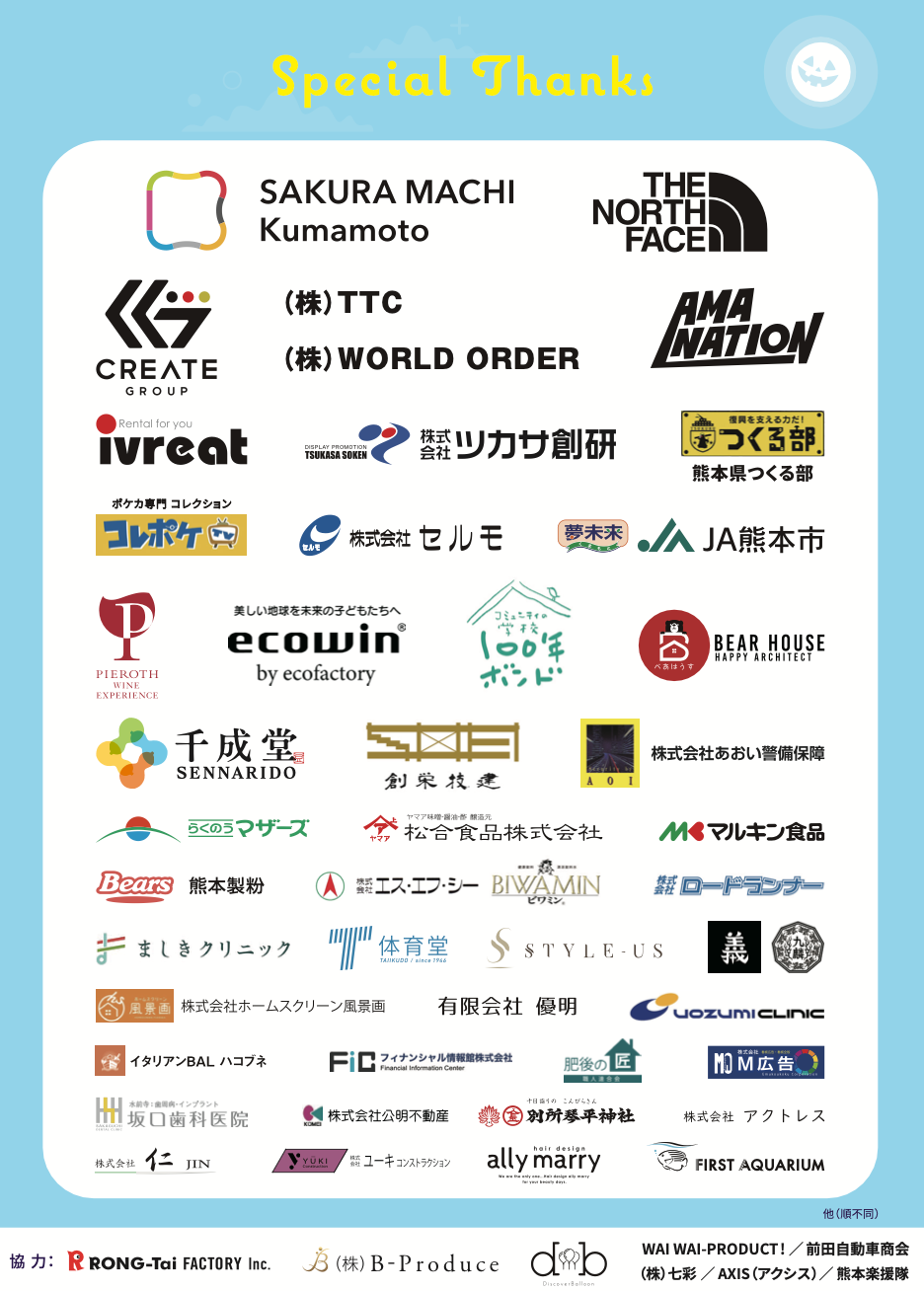 https://prcdn.freetls.fastly.net/release_image/7192/5/7192-5-4c0c6483ddc7f980d95aec4e8c6f4fc1-1026×1026.jpg We will be promoting “Kumamoto Halloween” nationwide, where you can have fun, learn about society, and connect with others. ■Sponsor Information Sponsor and exhibitor booths will be mainly made up of local companies, as well as numerous partners from Fukuoka and Tokyo. Kyushu Sanko Landmark Co., Ltd. (SAKURA MACHI Kumamoto) Cerumo Co., Ltd. OBIYAMA TETOTE (Obiyama Tetote) Sennarido Co., Ltd. Create Group Co., Ltd. WORLD ORDER Co., Ltd. TTC Co., Ltd. Amaneito Co., Ltd. Pieroth Japan Co., Ltd. etc… (in no particular order)