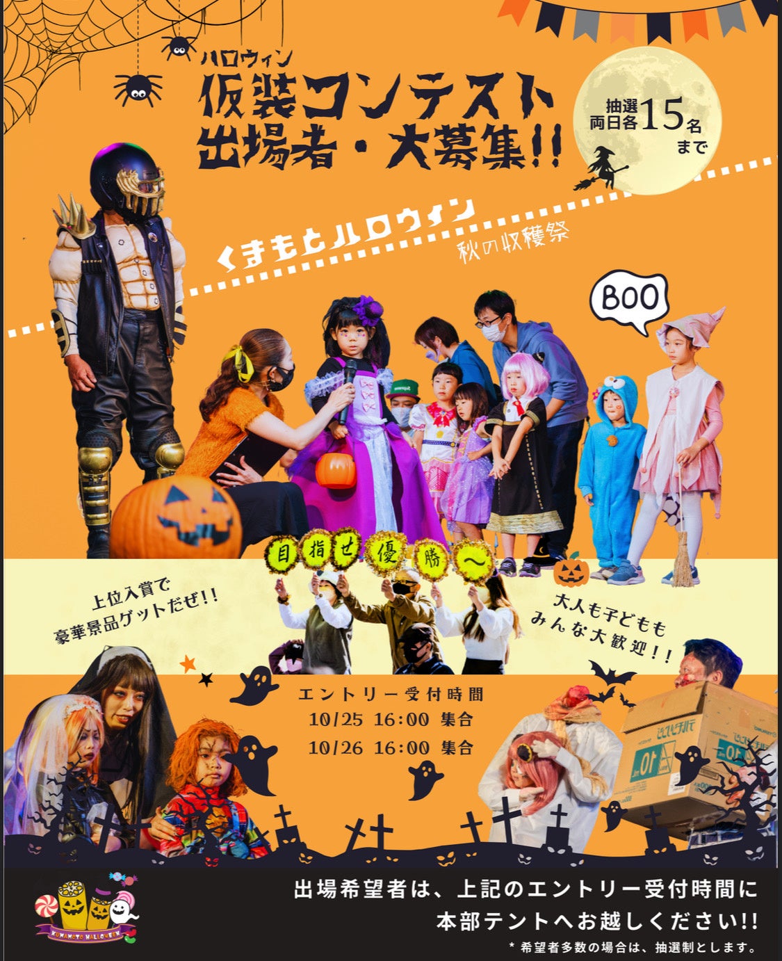 https://prcdn.freetls.fastly.net/release_image/7192/5/7192-5-6c9b586120e8b7f10ec35d908c5ed3f3-926×1332.png Kumamoto Halloween Stage Time Schedule for the 25th and 26th Main Content Introduction Kuma Haro Costume Contest (25th & 26th) A gorgeous costume stage with entries not only from Kumamoto but from all over the country. Grand prize winners will be decided in a variety of categories, including individual, family, kids, and group! Admission is free. Registration will begin at 4:00 PM on both days at the event headquarters on a first-come, first-served basis (planned).