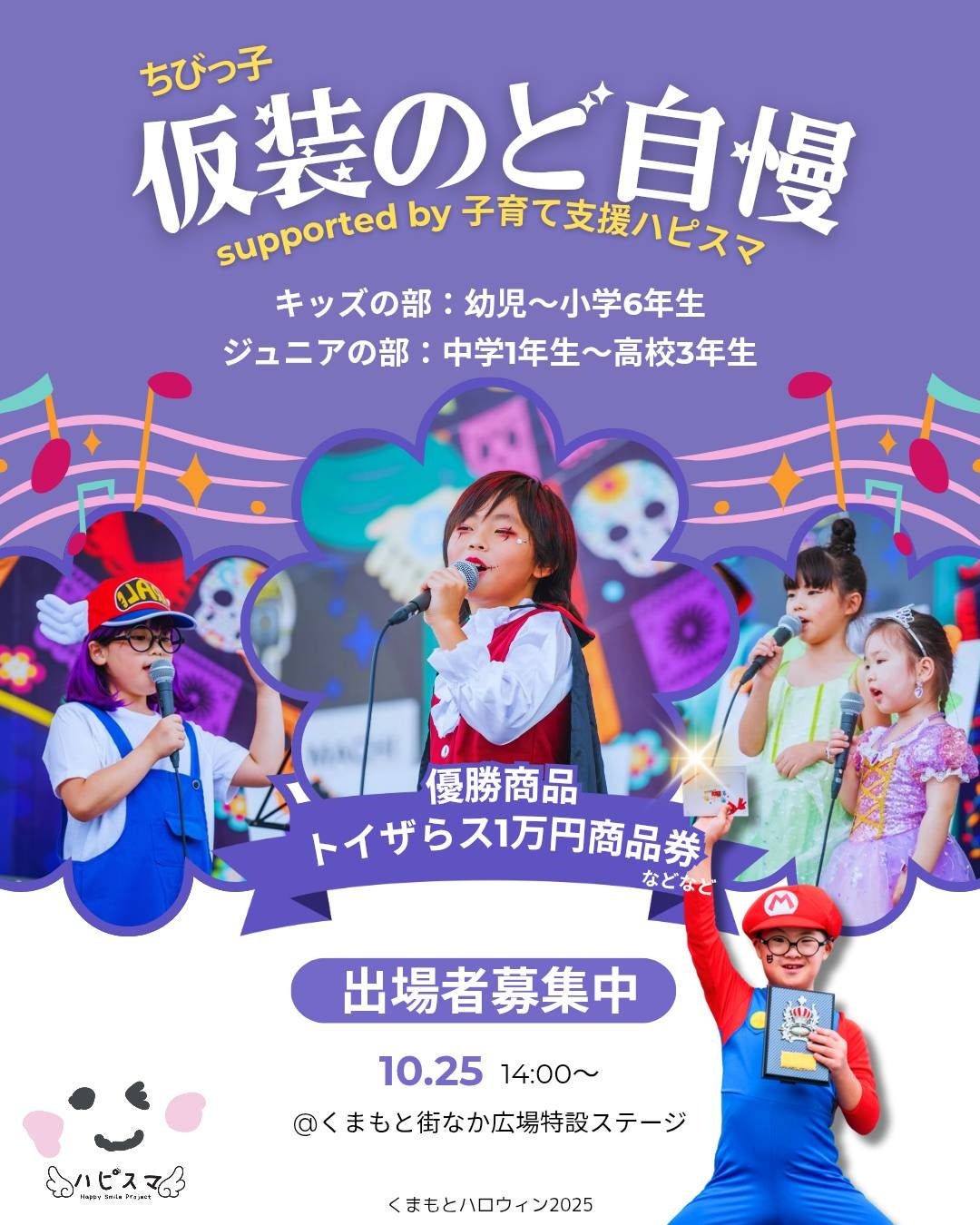 https://prcdn.freetls.fastly.net/release_image/7192/5/7192-5-b0425fbac6836d948f9a843823189739-2406×1608.png Halloween shooting Costume Singing Contest supported by Hapisma (25th only) Supported by the child-rearing support organization “Hapisma,” this event is open to children, primarily toddlers and elementary school students, and allows them to sing in costume. Kumamoto-based enka singer Shiranui Suzuka will host the event, bringing smiles to everyone’s faces with her energetic stage performance. (Applications are now closed. Thank you to everyone who applied!)