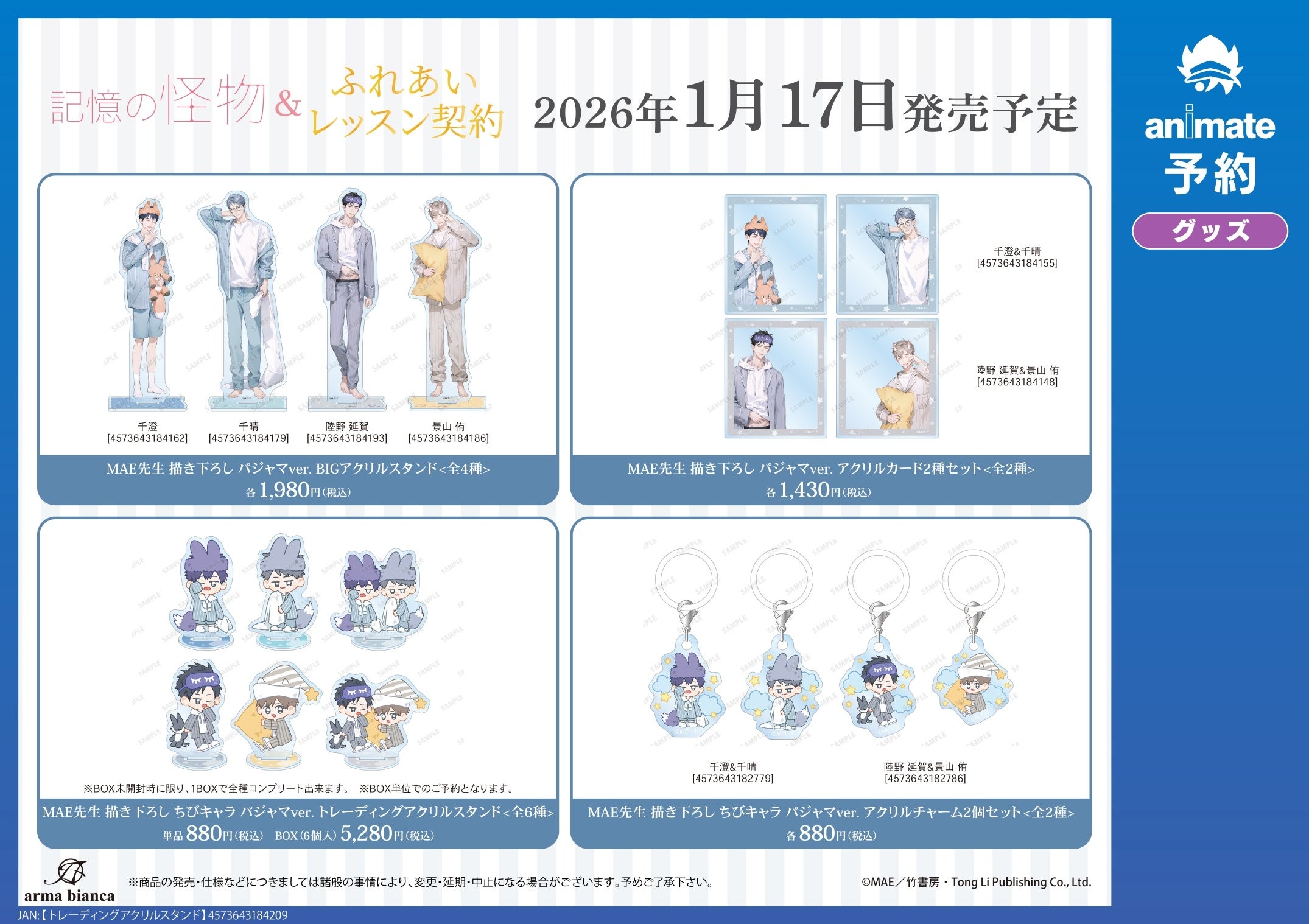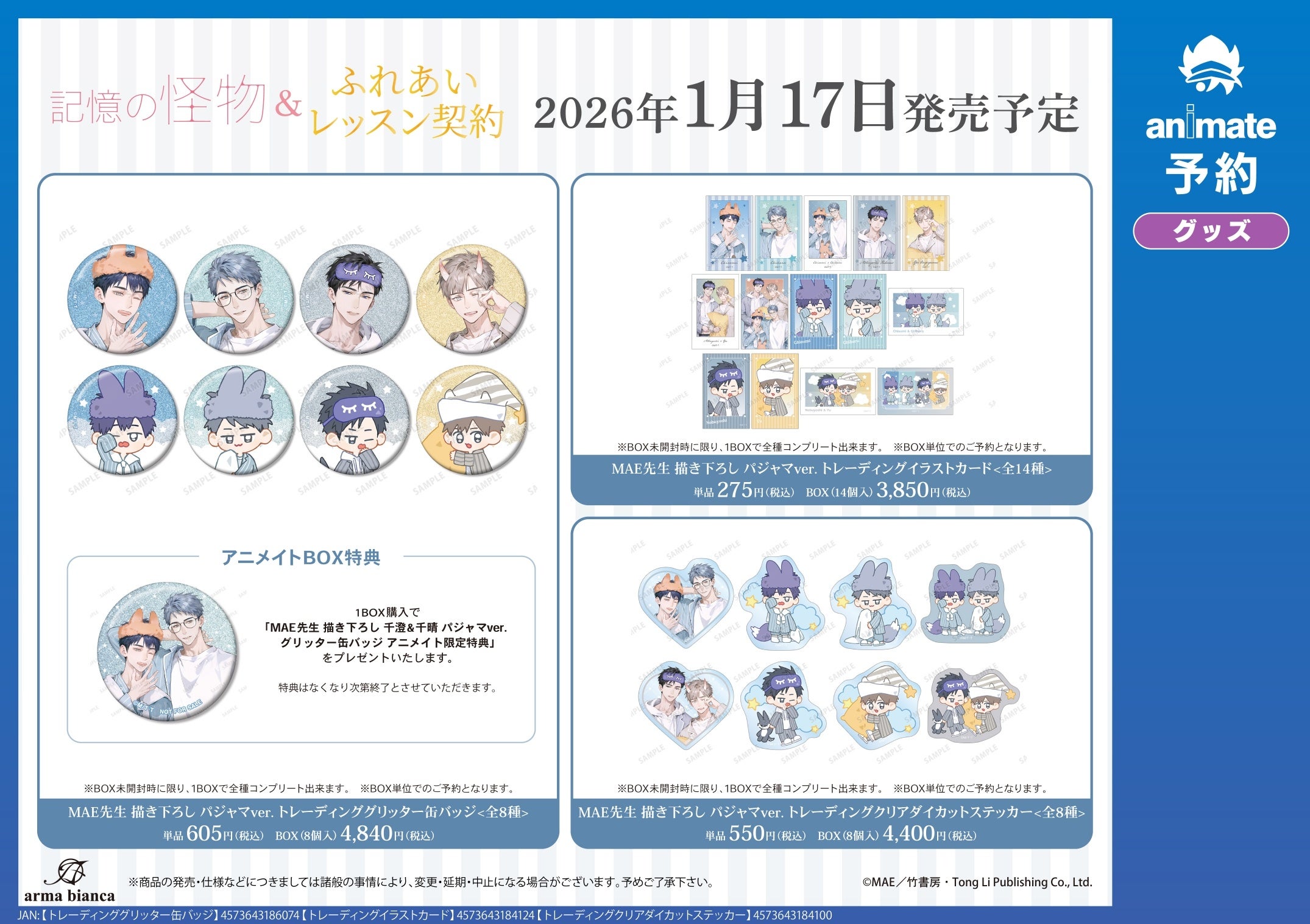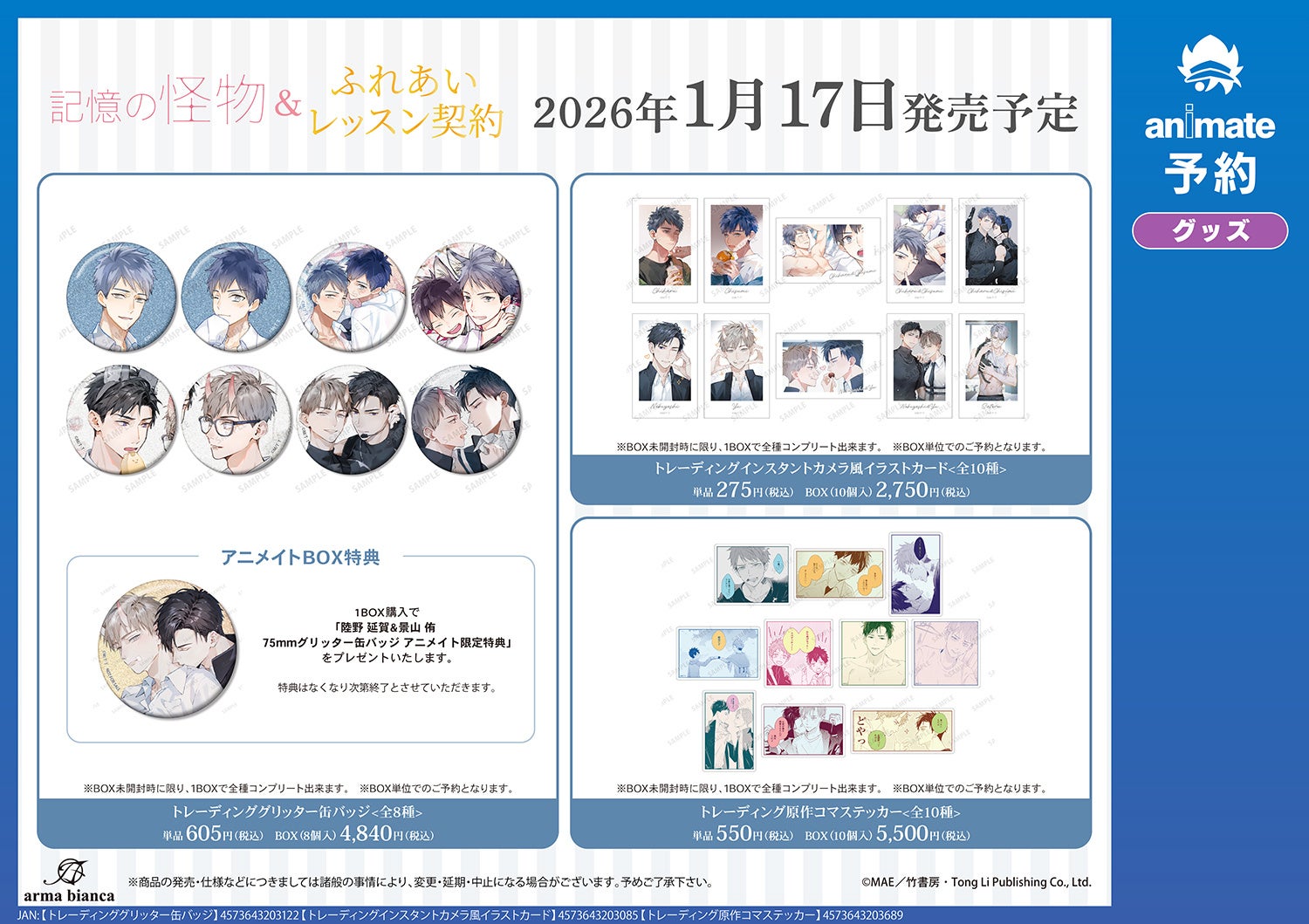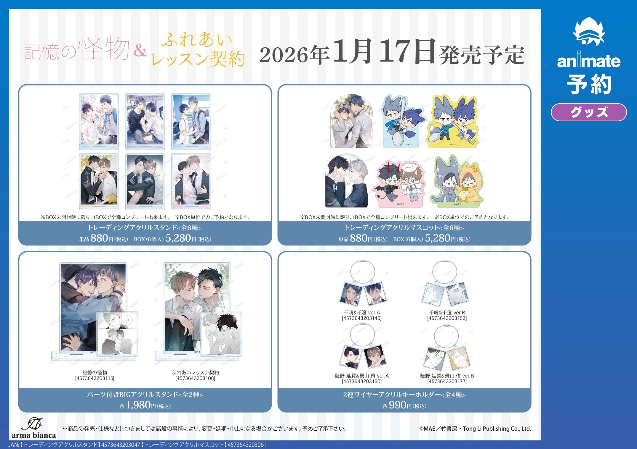 participating Animate stores. Takeshobo Co., Ltd. (Headquarters: Chiyoda-ku, Tokyo; President and CEO: Sumitaka Miyata) will be holding a fair for BL label Qpa works “Monster of Memory” and “Interaction Lesson Contract” (written by MAE) from Saturday, January 17, 2026.