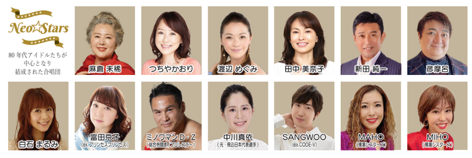 https://prcdn.freetls.fastly.net/release_image/87790/20/87790-20-11ebd1f80c74e6390a5834491232b54f-3900×2595.jpg Mr. Yukie Yoshikawa ・Neo☆Stars (Miki Asakura, Kaori Tsuchiya, Megumi Watanabe, Minako Tanaka, Junichi Nitta, Hikomaro, Marumi Shiraishi, Kyoko Tomita, Minowaman D.Z, Mai Nakagawa, SANGWOO, MAHO, MIHO) This power chorus group, centered around 1980s idols who are symbols of Japan’s vitality, was formed as a result of a TV program project. They have performed at various events across Japan, including the Osaka Expo, and are involved in social contribution activities such as the Pink Ribbon Campaign and animal welfare activities.