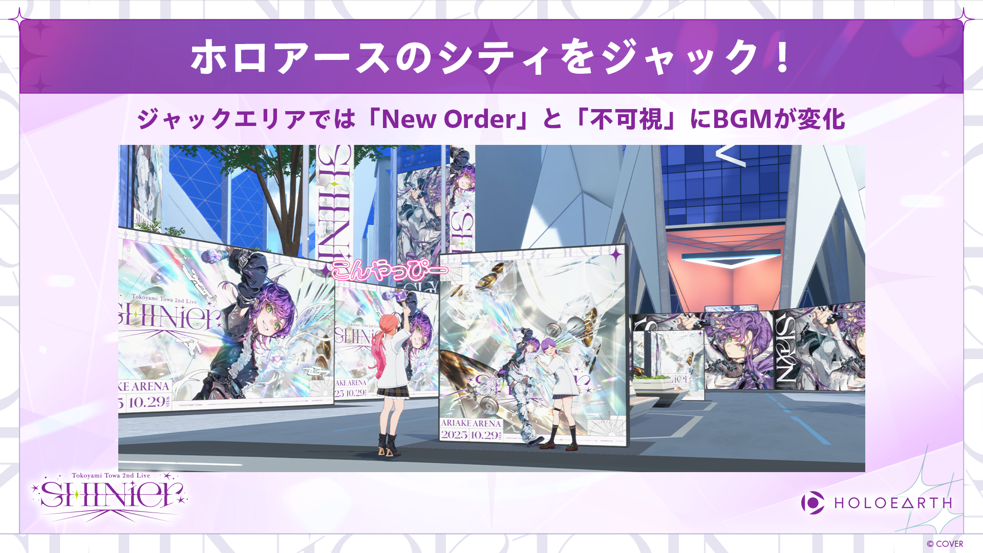 https://prcdn.freetls.fastly.net/release_image/30268/1188/30268-1188-eaf331950b5d9aae62e12d4f6d624c42-1920×1080.png A support event for Towa Tokoyami’s 2nd Live “SHINier” is currently being held on HoloEarth! During the event, HoloEarth will also be hosting a street-jacking event featuring the “SHINier” key visuals, and will be selling live merchandise such as live T-shirts and “SHINier lights.” In addition, the background music in the Jack Area will change to “New Order” and “Invisible.” Please support Tokoyami Towa 2nd Live on HoloEarth by using the hashtags “#TokoyamiTowa2nd” and “#HoloEarth”! Event Period Until 5:59 PM on Wednesday, November 5, 2025 (JST) *The date and time may be subject to change. Click here for details on Towa Towa’s 2nd Live “SHINier” ■Street Jack