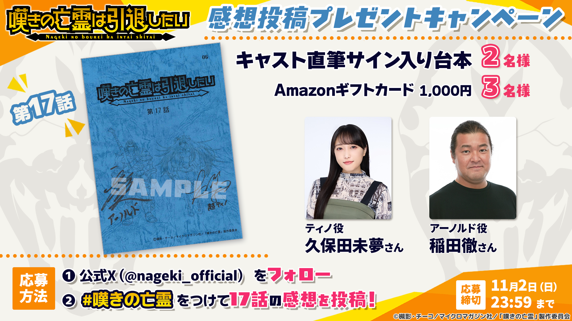 https://prcdn.freetls.fastly.net/release_image/90815/129/90815-129-b3d7d861015b68bd8aad97a526919f20-1920×1080.png To commemorate the broadcast of episode 17, we’re holding a campaign where you can win a script autographed by Miyu Kubota (voice of Tino Shade) and Toru Inada (voice of Arnold Hale) and a 1,000 yen Amazon gift card. 【How to Apply】 1. Follow the official X account
