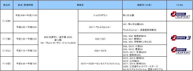 https://prcdn.freetls.fastly.net/release_image/14079/601/14079-601-11f09739b875ca47b796de80635e0d8f-1200×628.png ・Captain: Ryo Tamura “J I’m Ryo Tamura, the new cheer leader for SPORTS Rally Japan. Experience the world’s speeds on-site and deliver that excitement to your heart’s content! ” ・Campaign Member: Madoka Umemoto “This year, I will be participating in Rally Japan from an outside source for the first time as a J SPORTS presenter. Based on my experience participating for three consecutive years, I will delve into the behind-the-scenes of the race from a driver’s perspective!” – Member (Main MC): Kenjiro Toyohara “I’ll do my best with the help of Mr. Tamura and Mr. Umemoto so that I can deliver the world’s highest level of competition and the appeal of rally racing from various angles to everyone!” *1 J SPORTS is a sports television station available nationwide on cable television networks such as J:COM and BS broadcasts (SKY PerfecTV!). *2 J SPORTS On Demand is a paid service. For details, search for “J SPORTS On Demand.” *3 The Kuragaike Park Shakedown, to be held on Thursday, November 6th, will be streamed exclusively on J SPORTS On Demand. It will not be broadcast on television. ■ FORUM8 Rally Japan 2025 Program Lineup Live