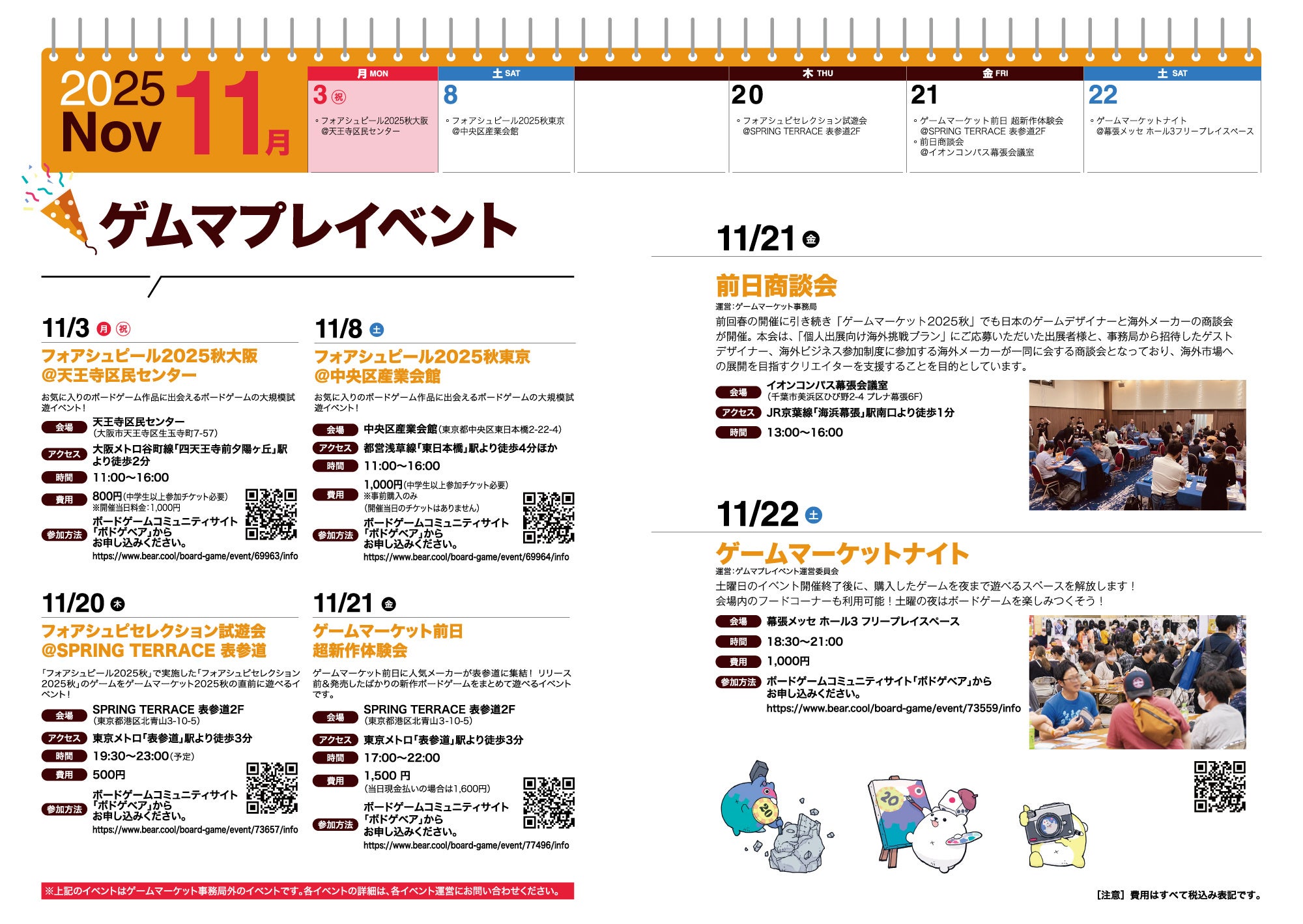collaborating with a wide range of pop culture. As part of this, we have partnered with Tokyo Comic Con 2025, which will be held at Makuhari Messe from Friday, December 5th to Sunday, December 7th, 2025. Tokyo Comic Con, which first took place in 2016, is a festival of all kinds of pop culture that can be enjoyed by people of all ages, from families to seniors. The spectacle of a wide variety of entertainment, including famous international actors such as Johnny Depp and Norman Reedus, domestic and international films, anime, games, comics, and even pro wrestling and karaoke, all gathered together is truly breathtaking. A Game Market introduction booth will be set up within the venue’s new interactive area, “Player’s Jungle.” This powerful collaboration will provide a new encounter between analog games and pop culture. Event summary Name: Game Market 2025 Autumn Venue: Makuhari Messe Exhibition Halls 3, 4, 5, and 6 Dates: Saturday, November 22, 2025 and Sunday, November 23, 2025 Event Hours: Saturday, November 22nd, 11:00 AM – 6:00 PM, Sunday, November 23rd, 11:00 AM – 5:00 PM Admission Fee: 1,500 yen (tax included) / Free for high school students and younger Admission tickets will be available for purchase at the event counter on the day of the event, but an additional handling fee of 500 yen (tax included) will be charged. Therefore, we recommend purchasing an electronic ticket even on the day of the event. (Electronic tickets can only be purchased by credit card on the day of the event.) To enter from 11:00 AM on Saturday, the 22nd, you will need to purchase an “Early Bird 11:00 AM Entry Ticket (Sat)” for 3,000 yen (tax included). Only 2,700 tickets are available, and they will be sold exclusively through Ticket Pia on a first-come, first-served basis. *From 12:00 on Saturdays and 11:00 on Sundays, high school students and younger are admitted free with their student ID. Elementary school students accompanied by a parent or guardian are also admitted free. *For early entry on Saturdays at 11:00 AM, tickets are required for each child, including high school students and younger, and elementary school students and younger. However, preschool children accompanied by a parent or guardian are admitted free of charge at all times. For details about the event, please visit the official website (https://www.gamemarket.jp/ ). ▼How to purchase tickets Advance sales of electronic tickets will begin on Friday, October 24th at 10:00 AM on e and Ticket Pia. *Please note that the types of tickets available vary depending on the sales site. “Ticket Pia” URL: https://w.pia.jp/t/gamemarket/ Tickets on sale: November 22nd (Saturday) Early Bird 11:00 AM Entry Ticket / 12:00 PM Entry Ticket November 23rd (Sunday) 11:00 AM Entry Ticket “E ” URL: https://eplus.jp/gamemarket/ Tickets on sale: November 22nd (Saturday) 12:00 PM entry November 23rd (Sunday) 11:00 AM entry ▼How to apply for the expedition tour (Sales: Cool Japan Travel) The “Game Market 2025 Autumn Expedition Tour Plan” will support visitors from far away. See below for details. URL: