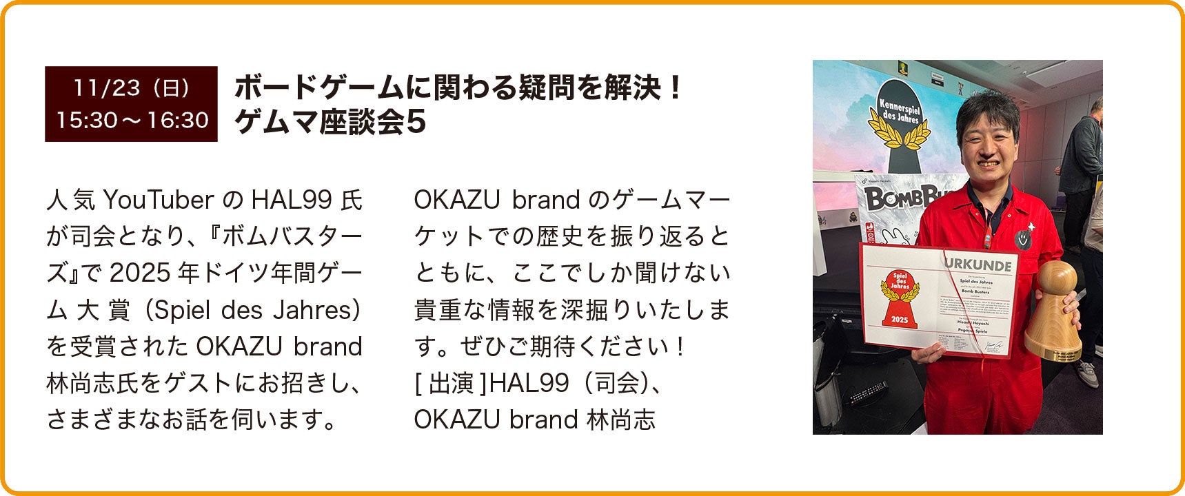 https://prcdn.freetls.fastly.net/release_image/41113/63/41113-63-7b727b0d23e325d18dfb5c37a91242ad-1719×720.jpg Also, on the special stage, we’ll be joined by Takashi Hayashi of OKAZU brand, winner of the 2025 Spiel des Jahres (German Game Award), the most prestigious award in the board game industry. We’ll celebrate this incredible achievement by a Japanese creator with everyone in the audience. We’ll also look back on OKAZU brand’s history at the game market, delve into the background of their globally acclaimed work, and share valuable information you can only hear here. Don’t miss it! ▼Collaboration with the pop culture festival “Tokyo Comic Con”