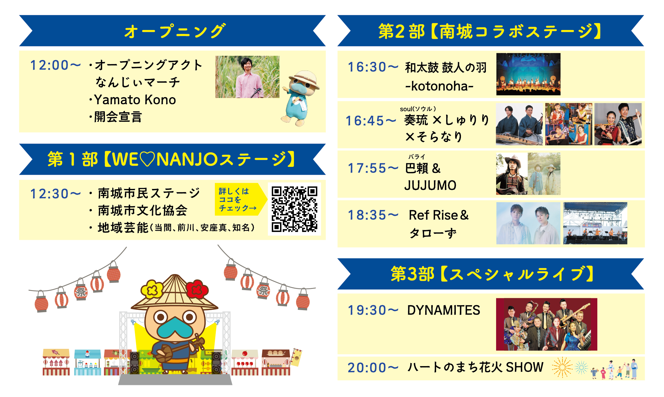 【Sokudo Co., Ltd.】 The Nanjo City Festival, which was previously held once every four years, has been decided to be held annually! Continuing from last year, the theme is “WE (heart) NANJO.” Let’s all come together again this year in the name of love for Nanjo City! Speed Inc. Press Release: October 24, 2025 The Nanjo City Festival, previously held once every four years, has been decided to be held annually! Following on from last year, the theme is “WE (heart) NANJO.” Let’s all come together again this year in the name of love for Nanjo City! The special live performance will feature oldies band DYNAMITES, enjoyable for all generations! Also worth watching is the father-son performance by Ref Rise & Taro’s! Be sure to also enjoy the spectacular “Heart Town Fireworks Show.” The 6th Nanjo City Festival (sponsored by the Nanjo City Festival Executive Committee), which aims to discover the charms of Nanjo City and promote the local area, will be held on Sunday, November 16, 2025. Until now, the festival has been held once every four years, but starting this year, it has been decided to hold it annually. Continuing from the previous year, the festival will use the catchphrase “WE (heart) NANJO” to aim for the festival to be an opportunity for citizens involved in the festival to learn about the nature, history, culture, and industry of Nanjo City, and to foster a love for the community.