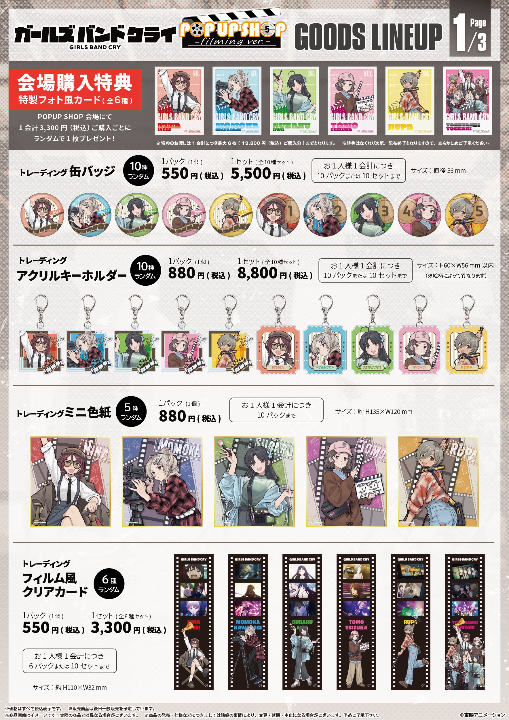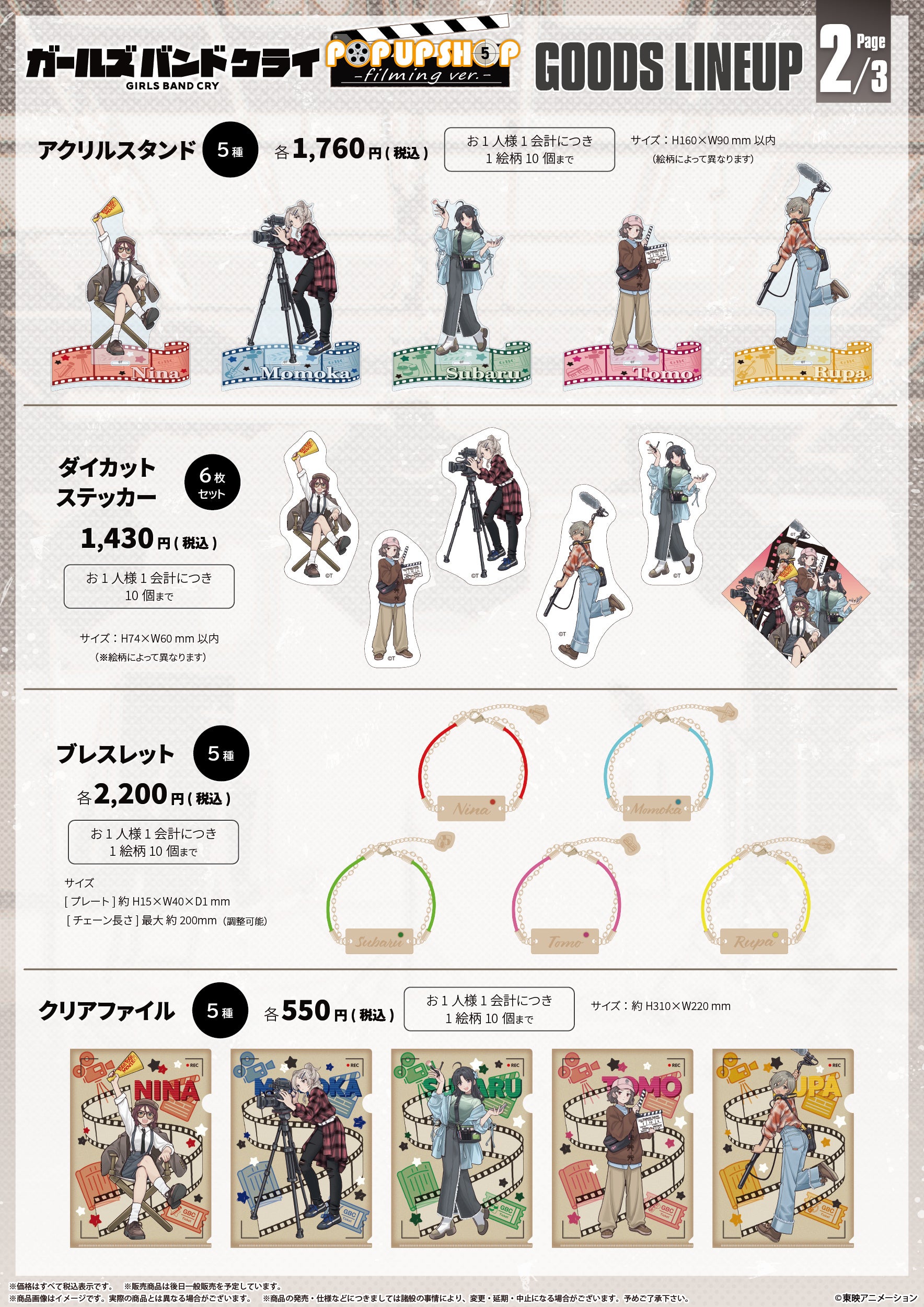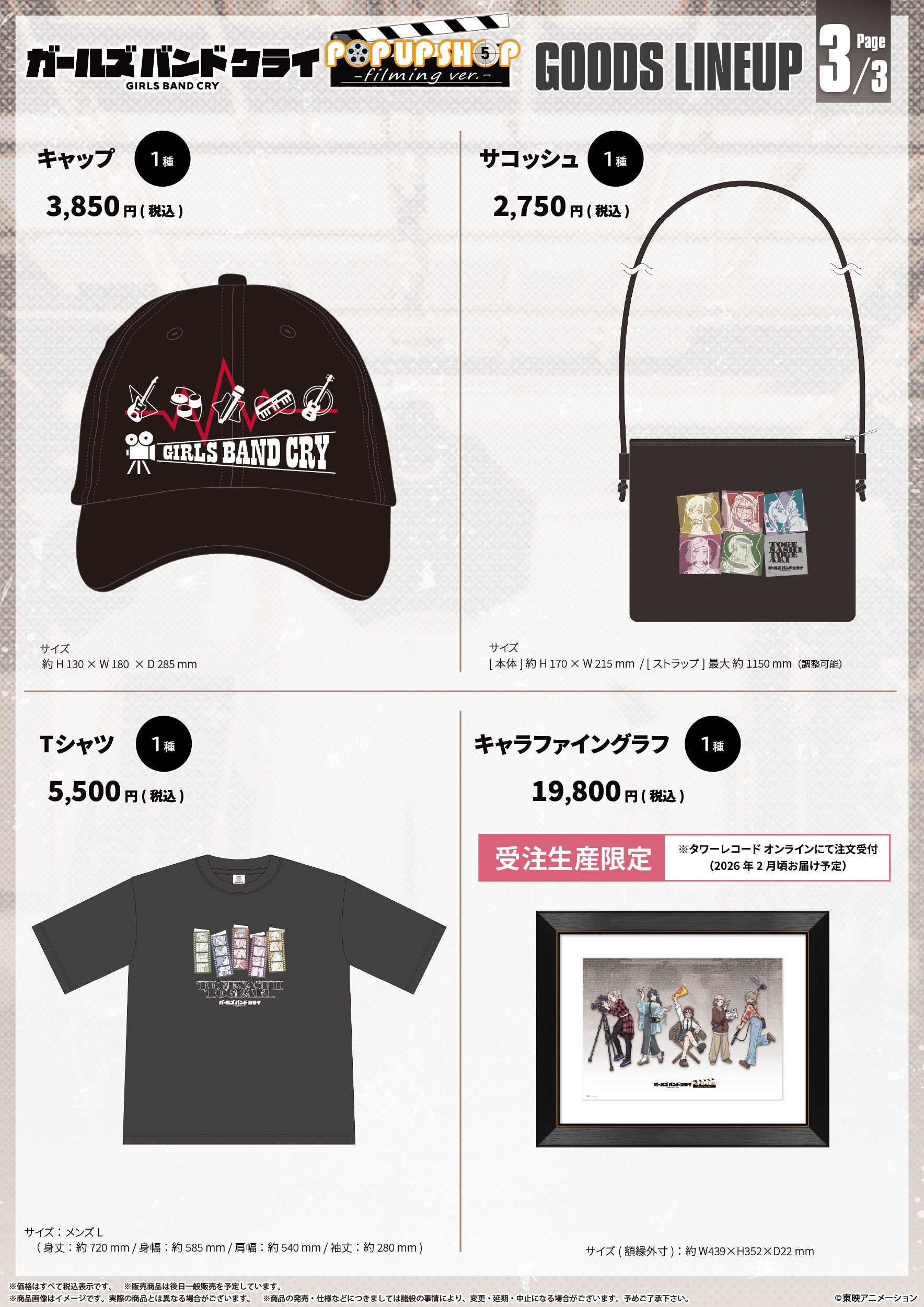 https://prcdn.freetls.fastly.net/release_image/31422/2426/31422-2426-da690f4e753c235ed68c13a22143bea7-1768×2500.jpg From the original TV anime “Girls Band Cry,” we’re revealing original illustrations of Isekiri Nina, Kawaraki Momoka, Yasuwa Subaru, Ebitsuka Satoshi, and Rupa’s Sakai Kasumi dressed as film crew members! At the “Girls Band Cry POP UP SHOP -filming ver.-,” you can enjoy new merchandise featuring original illustrations by Kasumi Sakai, as well as a life-size standee exhibit. Also, for every ¥3,300 (tax included) spent at the POPUP SHOP, you’ll receive one random “special photo-style card (6 types)”! *The maximum number of cards per transaction is 6. *Life-size standees will only be on display at Tower Records Shibuya. *If a large number of customers are expected to visit the store, we may limit entry or require numbered tickets. We appreciate your understanding. [Event Information] ■Girls Band Cry POP UP SHOP -filming ver.- November 15th (Sat) – 26th (Wed) 2025 ・Tower Records Nagoya Kintetsu Passe Store (TOWER SPACE NAGOYA) 〒450-0002 Kintetsu Passe 9F, 1-2-2 Meieki, Nakamura-ku, Nagoya, Aichi Prefecture Business hours: 10:00 – 21:00 ・Tower Records Fukuoka Parco Store (TOWER SPACE FUKUOKA) 〒810-0001 Fukuoka Parco 6F, 2-11-1 Tenjin, Chuo-ku, Fukuoka City, Fukuoka Prefecture Business Hours: 10:00 – 20:30 December 1st (Mon) – 14th (Sun), 2025 ・Tower Records Shibuya Store 2F (TOWER SPACE SHIBUYA) 〒150-0041 1-22-14 Jinnan, Shibuya-ku, Tokyo Business hours: 11:00 – 21:00 ・Tower Records Abeno Hoop Store (TOWER SPACE ABENO) 〒545-0052 Abeno Hoop 6F, 1-2-30 Abeno-suji, Abeno-ku, Osaka City, Osaka Prefecture Business Hours: 11:00 – 21:00 *Please note that the opening hours of each store may differ from those of the facility. Saturday, November 15, 2025 – Sunday, December 14, 2025 ・Tower Records Online ▼ “Girls Band Cry POP UP SHOP -filming ver.-” Special Page