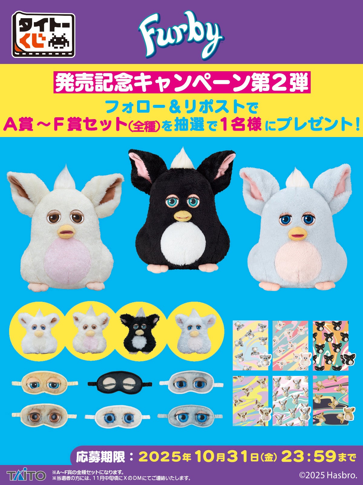 https://prcdn.freetls.fastly.net/release_image/41970/620/41970-620-bd8af734653ba7281013b1d78a209a97-1200×1600.jpg To commemorate the release of “Taito Lottery Furby,” we are holding a campaign where one lucky winner will win a set of Prizes A through F (all types). [How to apply] 1. Follow Taito Lottery Official X (@taito_kuji) 2. Repost the eligible post [Application Period] From 12:00 PM on Saturday, October 25, 2025 to 11:59 PM on Friday, October 31, 2025 ・Taito Lottery Official *The first launch campaign has ended. ●“Taito Kuji Furby” Overview [Product Name] Taito Lottery Furby [Release Date] Saturday, October 25, 2025 [Price] 770 yen per play (tax included) [Number of Grades] 6 grades in total LH (Last Happy) Prize [Available at] FamilyMart convenience stores nationwide (some stores excluded) *Release dates may vary by store, and some stores may not carry this product. *This offer will end while supplies last. ・Taito Kuji official website: